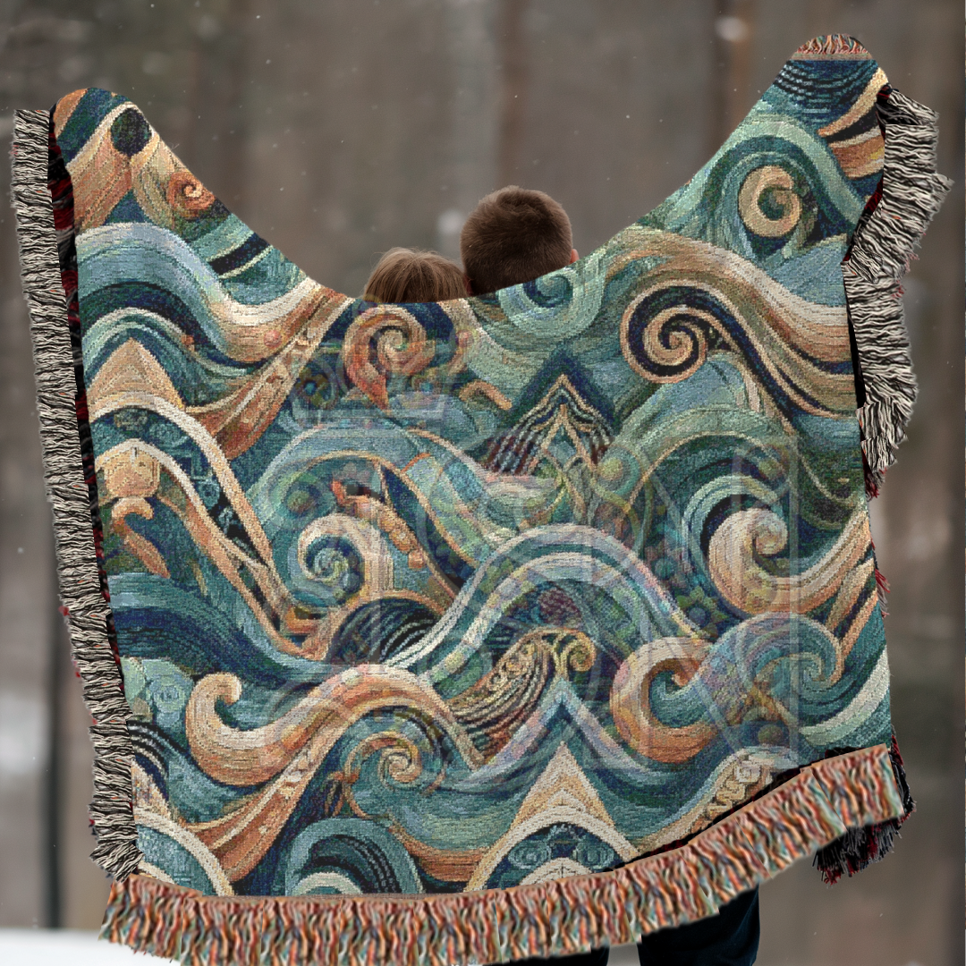 The Wild Ocean Waves woven throw captures the untamed beauty of the sea through flowing abstract patterns. With curling, swirling lines in shades of deep teal, soft blue, sand, and seafoam, this design evokes the movement of waves and wind, bringing coastal energy and calm to your space.