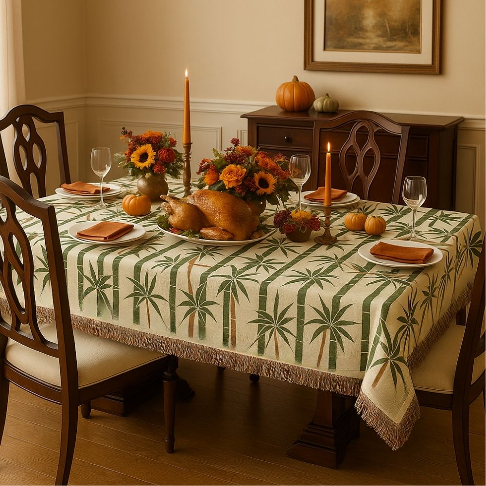 Bring serene nature into your space with this Bamboo Forest Woven Throw Blanket, featuring vertical bamboo stalks in rich olive green and warm tan on a soft cream background. The rhythmic vertical pattern adds a sense of height and stillness to any room.