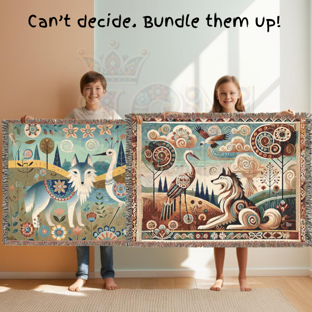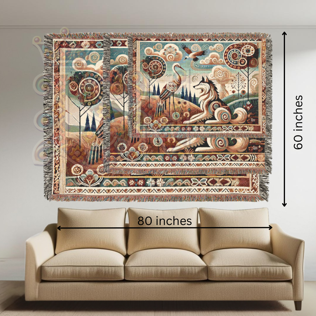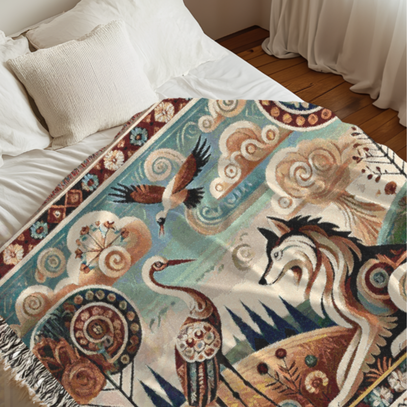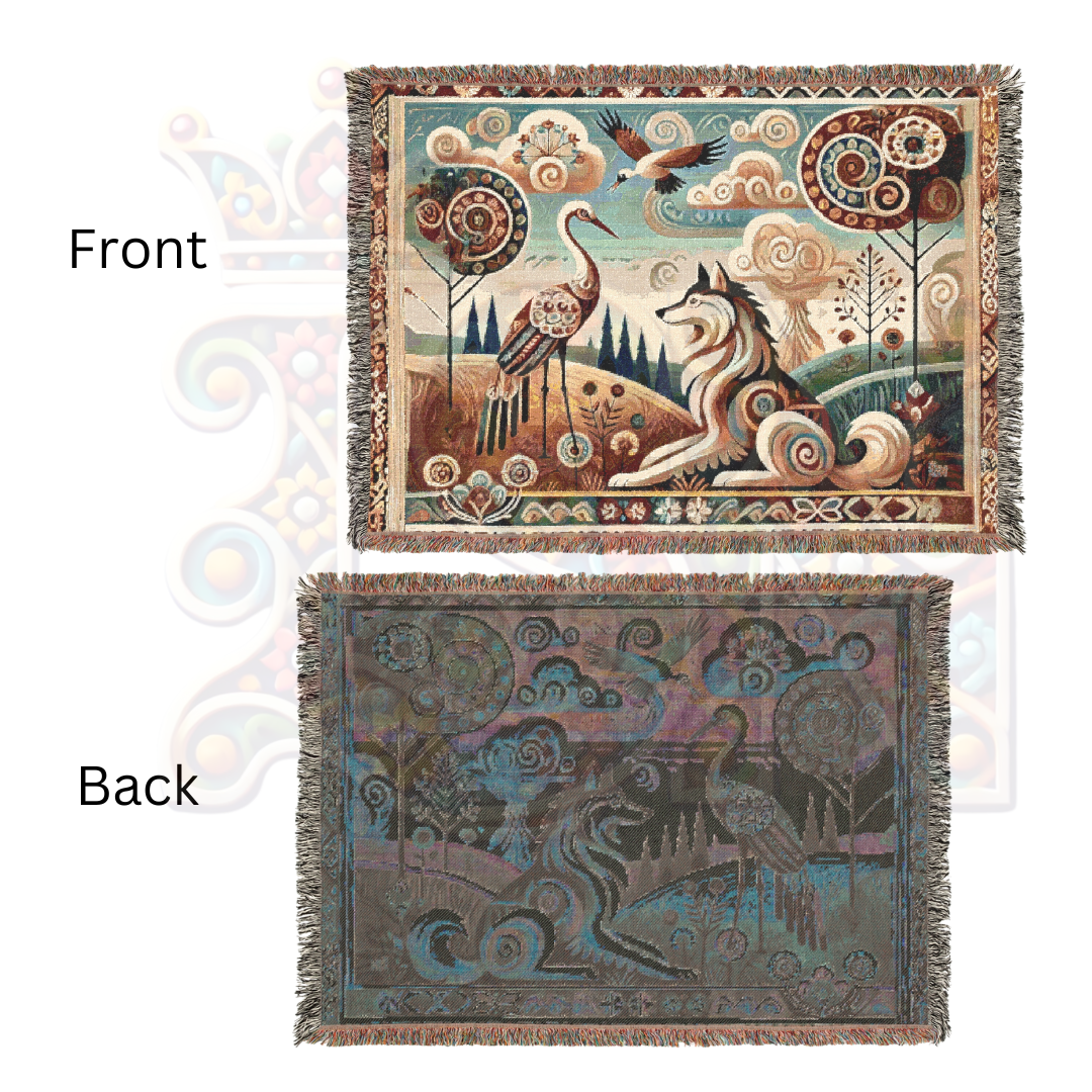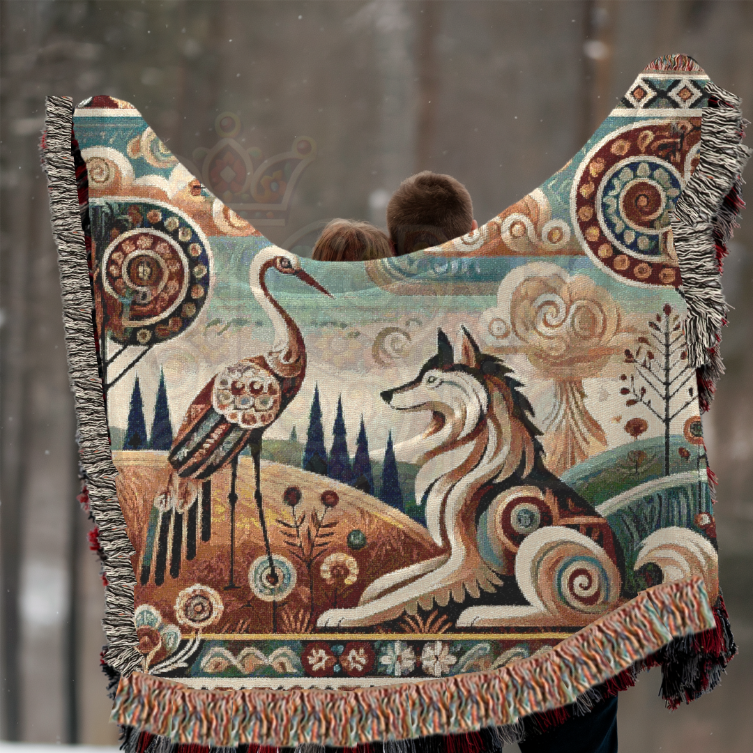 🌿 A dreamlike fusion of nature and folklore! Inspired by Aesop's fables. This enchanting woven tapestry blanket features a majestic wolf and an elegant crane, surrounded by delicate florals, rolling hills, and a mystical atmosphere. The soft pastel blues, earthy greens, and golden accents create a peaceful, bohemian-inspired aesthetic, making it perfect for those who love whimsical art, nature, and cozy vibes.