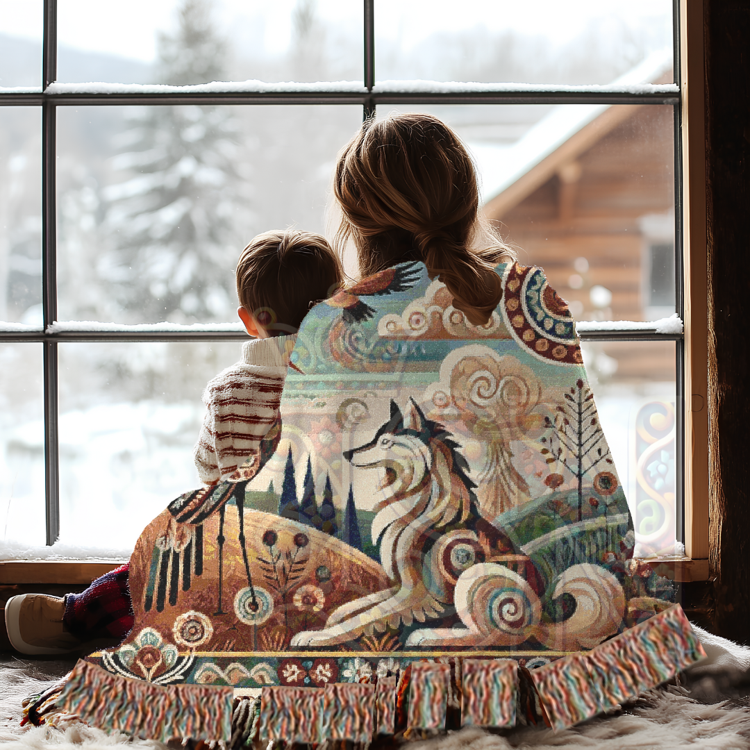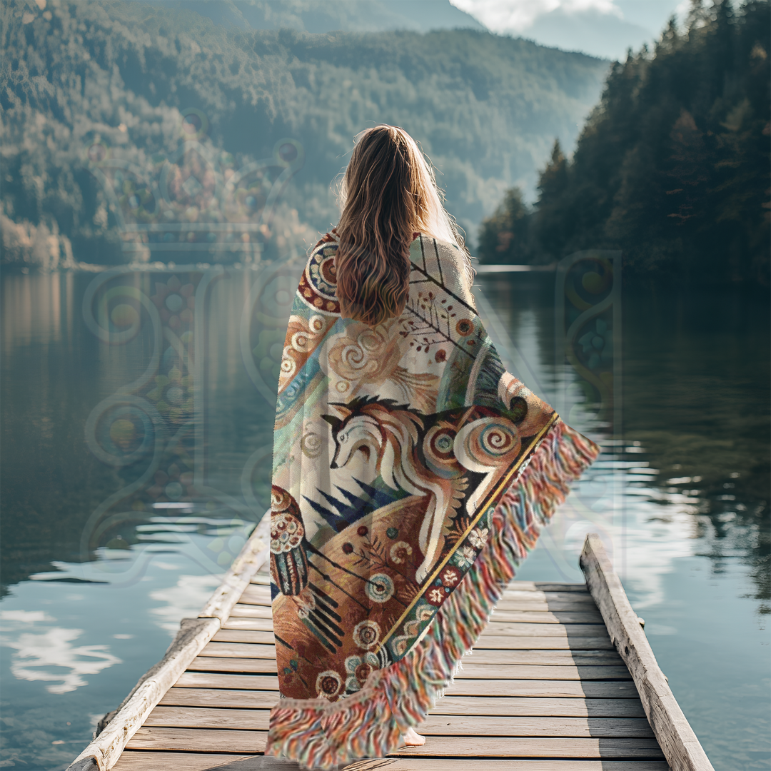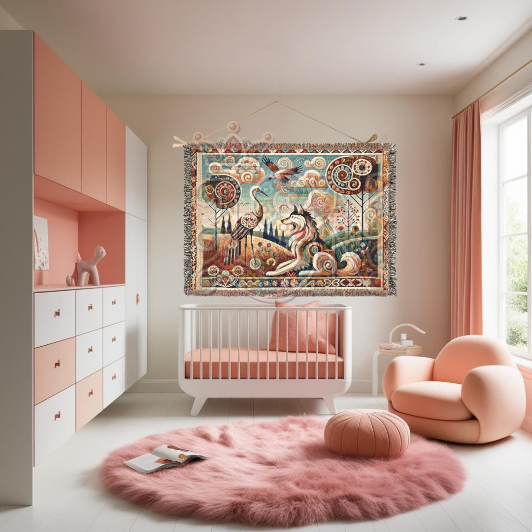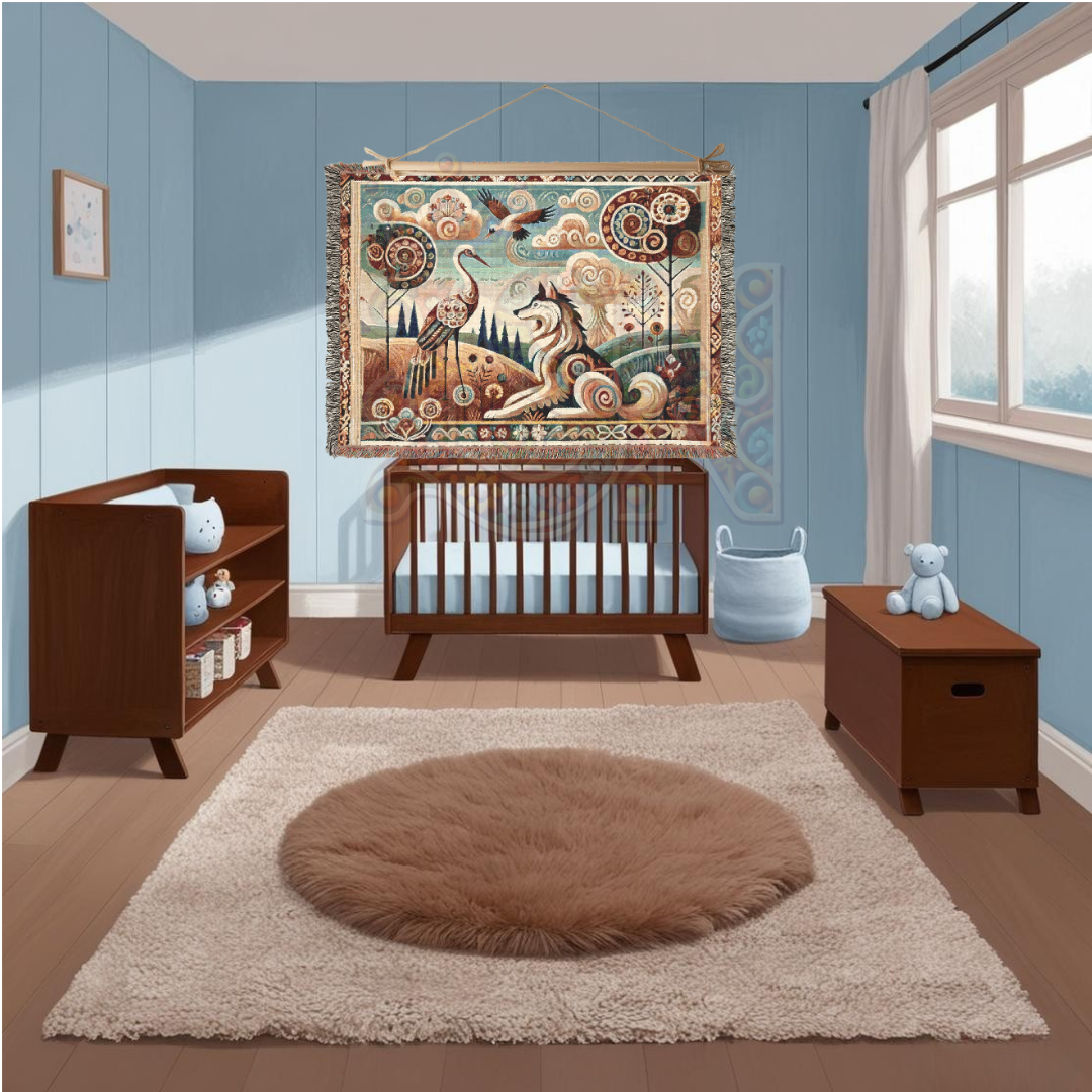 🌿 A dreamlike fusion of nature and folklore! Inspired by Aesop's fables. This enchanting woven tapestry blanket features a majestic wolf and an elegant crane, surrounded by delicate florals, rolling hills, and a mystical atmosphere. The soft pastel blues, earthy greens, and golden accents create a peaceful, bohemian-inspired aesthetic, making it perfect for those who love whimsical art, nature, and cozy vibes.