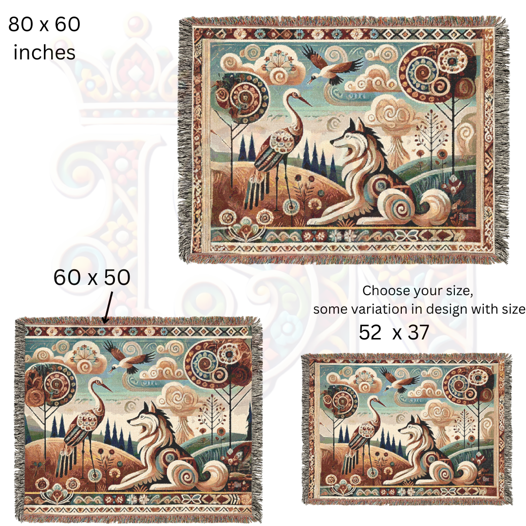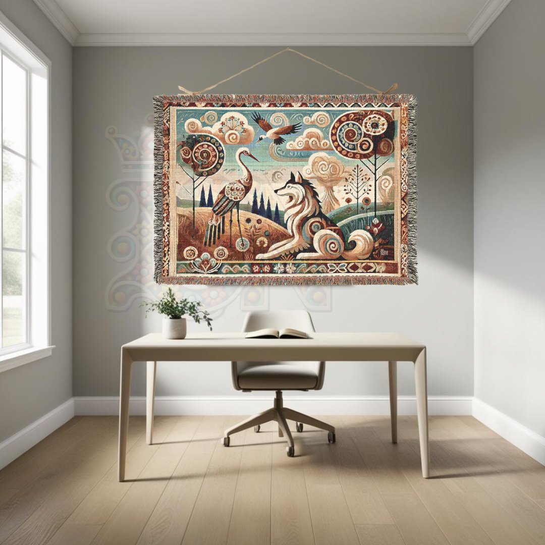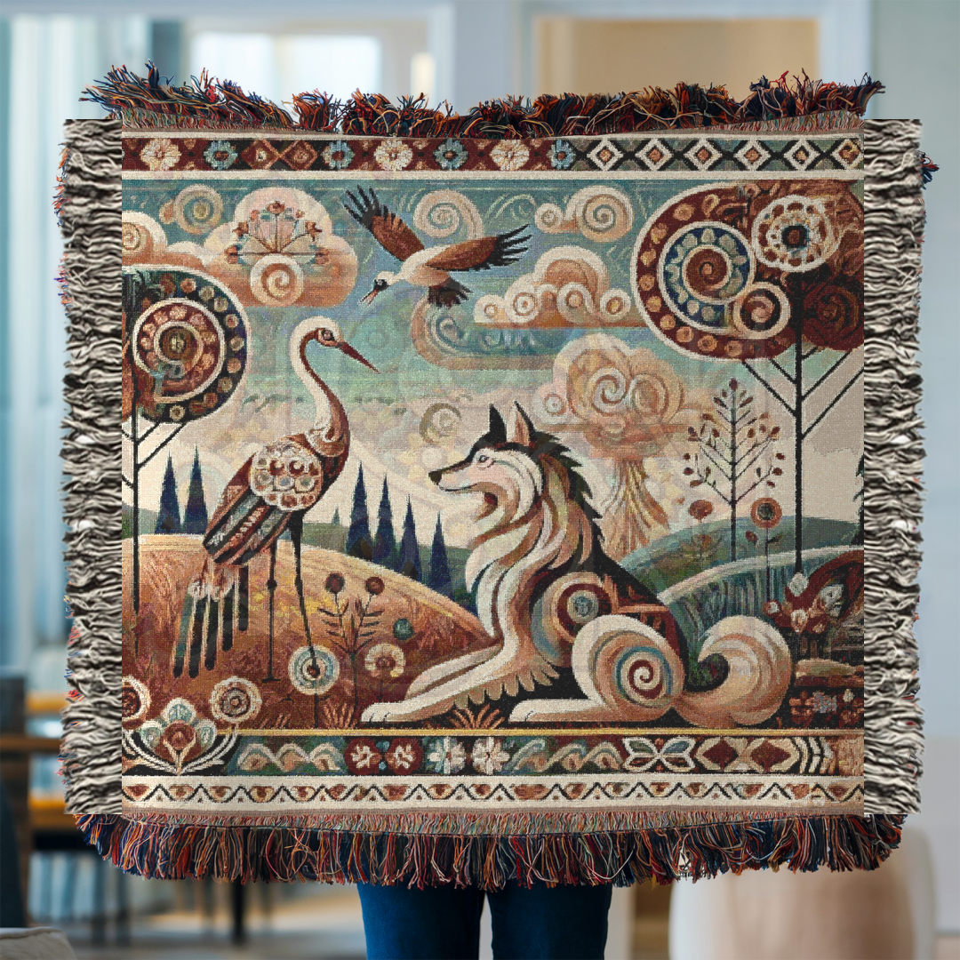 Boho Mystical Wolf & Crane Tapestry Blanket – Inspired by Aesop's Fables - Folk Art Nature Woven Throw, Whimsical Animal Decor for Dreamy Homes & Cozy Spaces