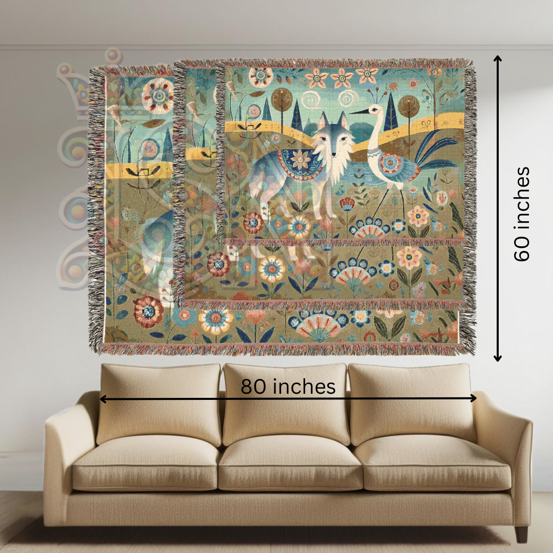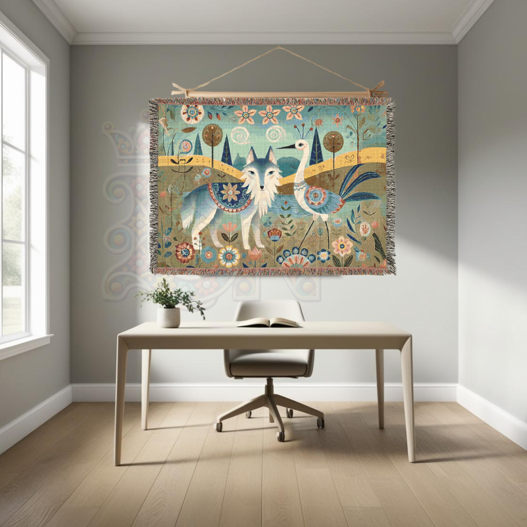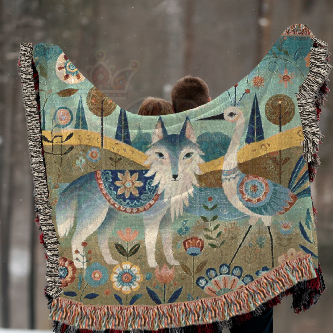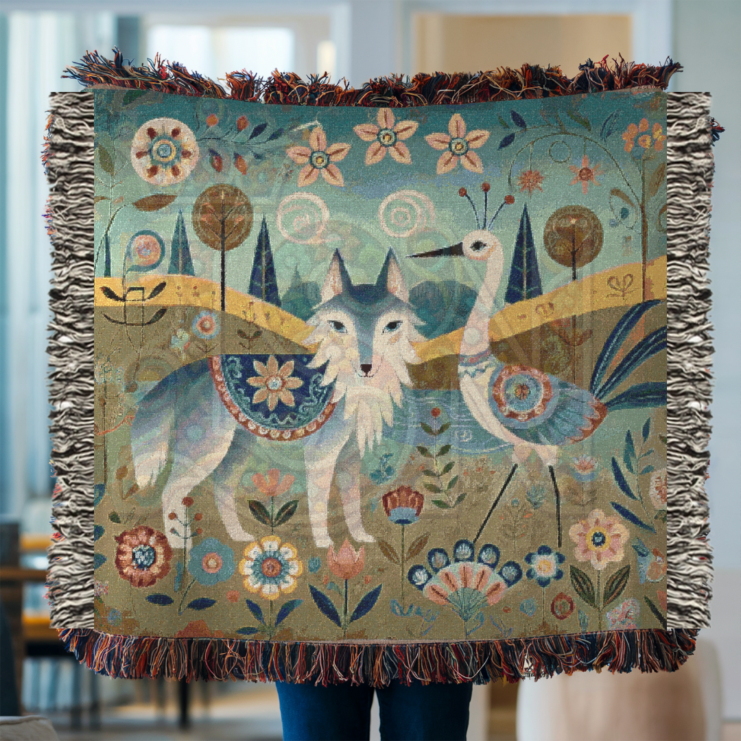 🌿 A dreamlike fusion of nature and folklore! Inspired by Aesop's fables. This enchanting woven tapestry blanket features a majestic wolf and an elegant crane, surrounded by delicate florals, rolling hills, and a mystical atmosphere. The soft pastel blues, earthy greens, and golden accents create a peaceful, bohemian-inspired aesthetic, making it perfect for those who love whimsical art, nature, and cozy vibes.