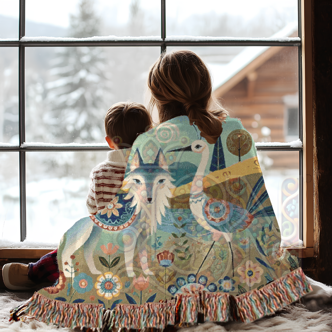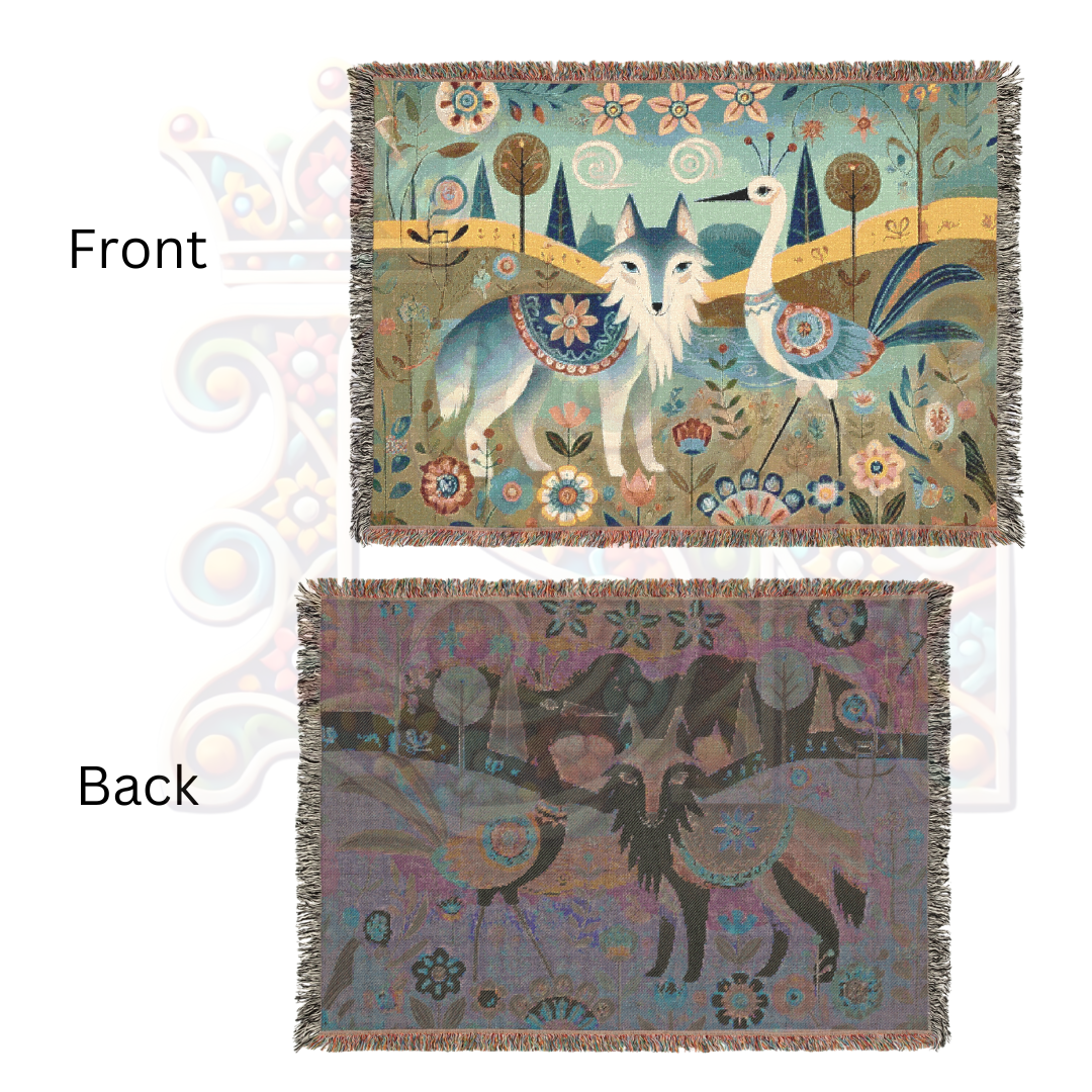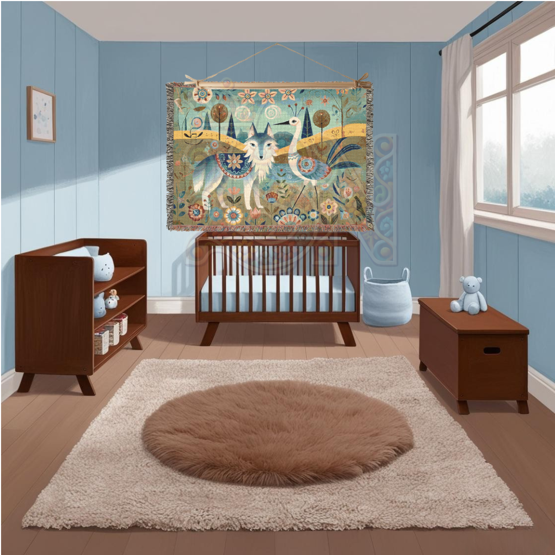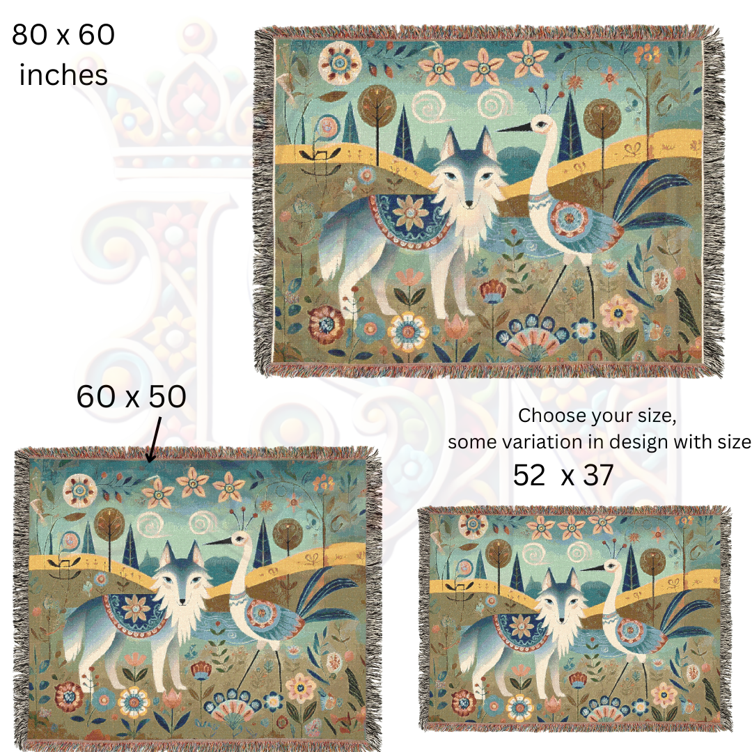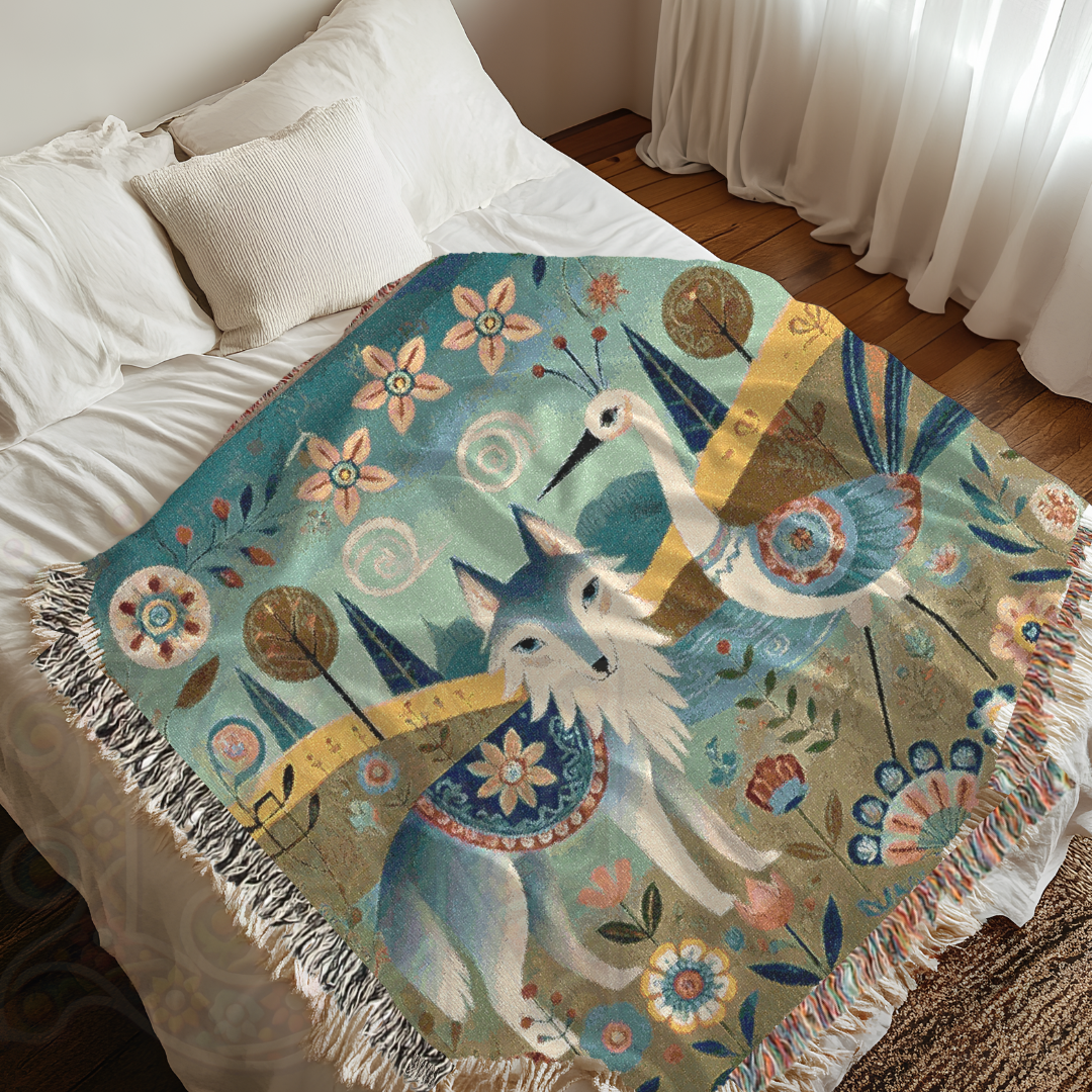 🌿 A dreamlike fusion of nature and folklore! Inspired by Aesop's fables. This enchanting woven tapestry blanket features a majestic wolf and an elegant crane, surrounded by delicate florals, rolling hills, and a mystical atmosphere. The soft pastel blues, earthy greens, and golden accents create a peaceful, bohemian-inspired aesthetic, making it perfect for those who love whimsical art, nature, and cozy vibes.