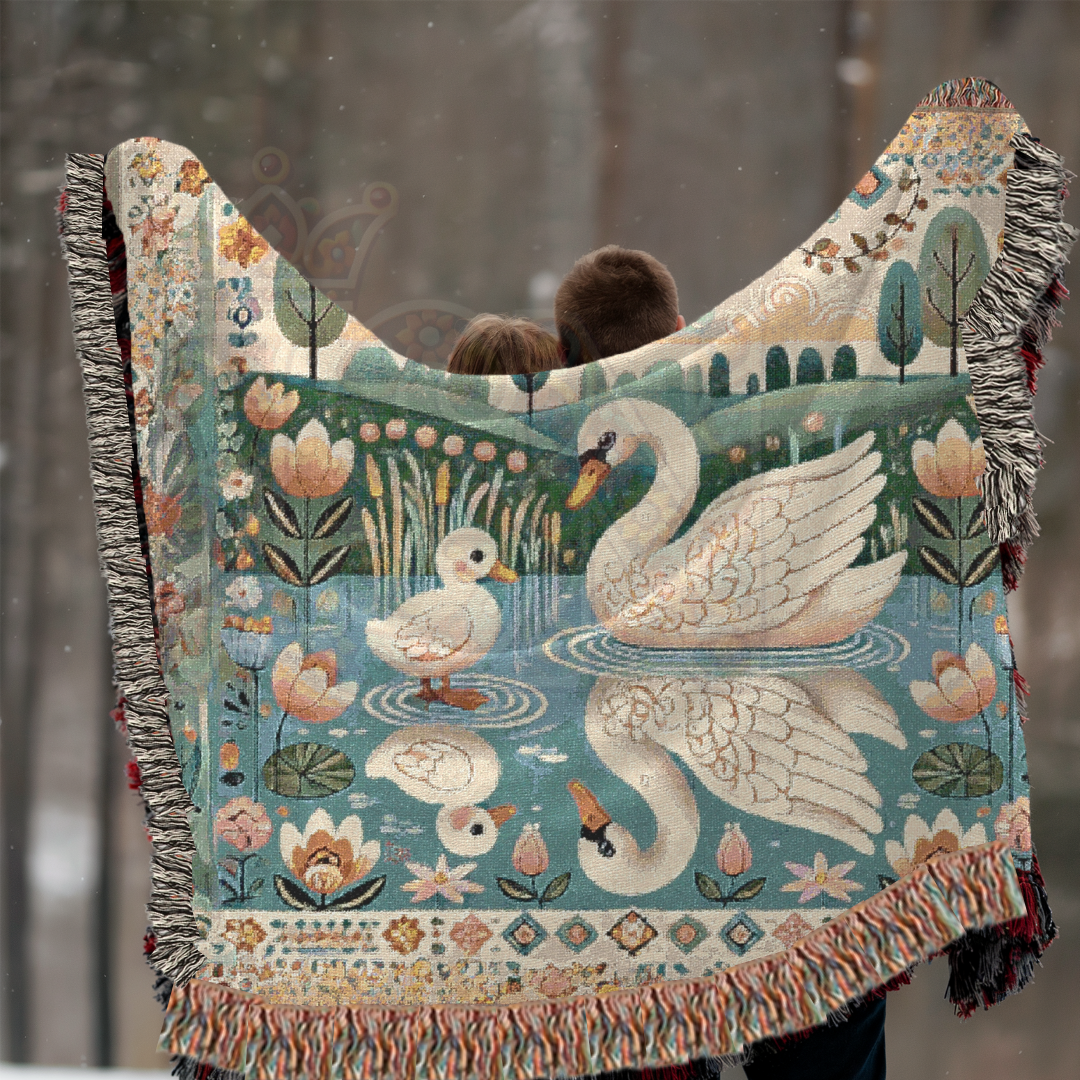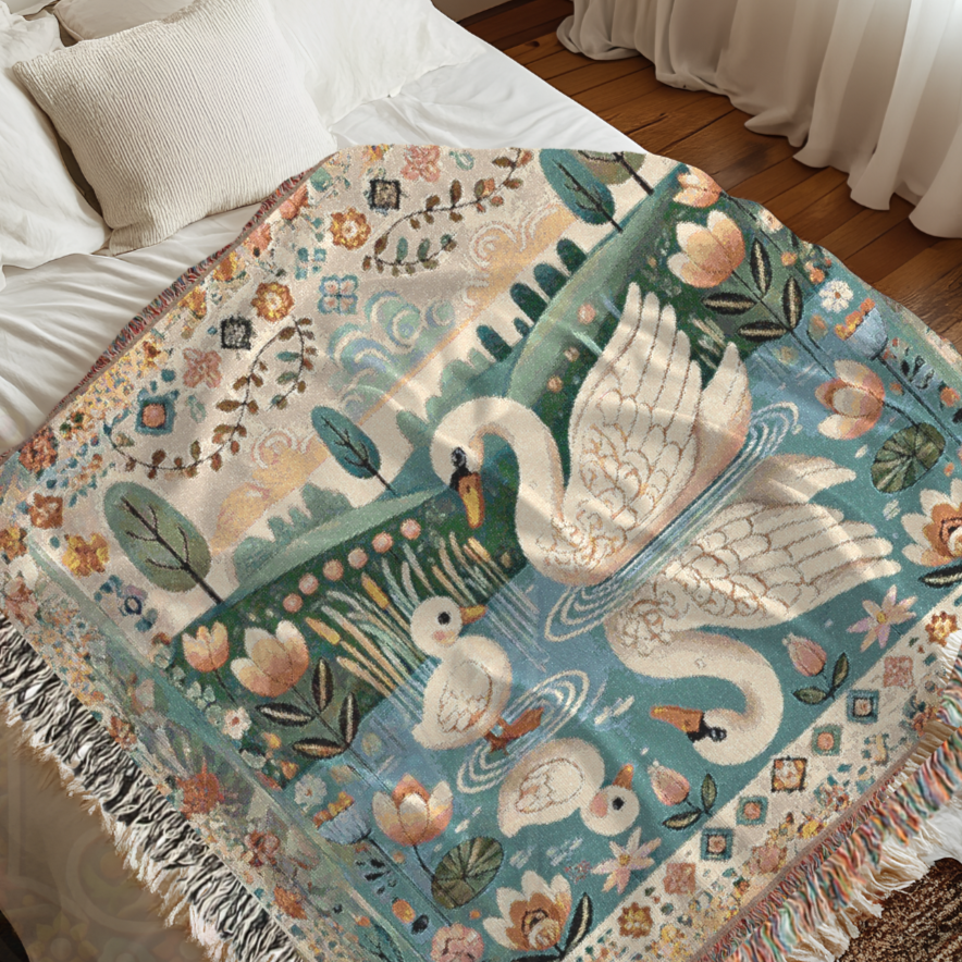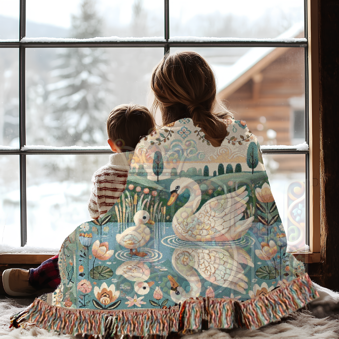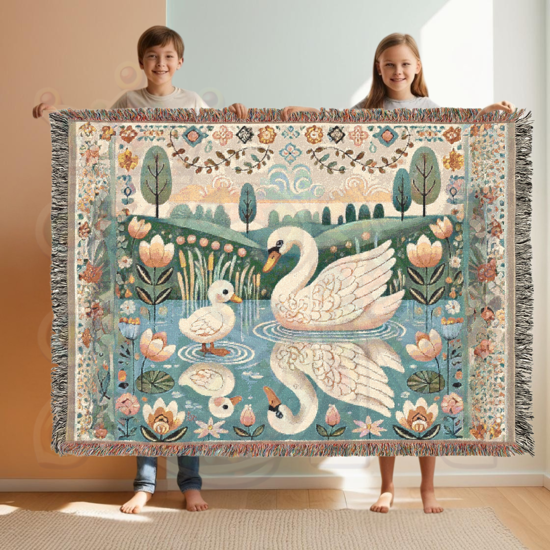 Enchanting Swan & Duckling Woven Throw Blanket – Nature-Inspired, Folk Art-Inspired Cozy Home Décor