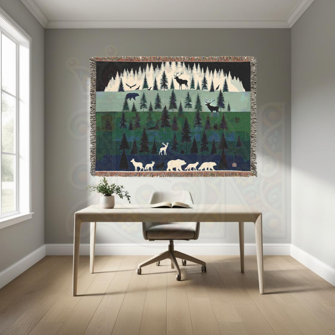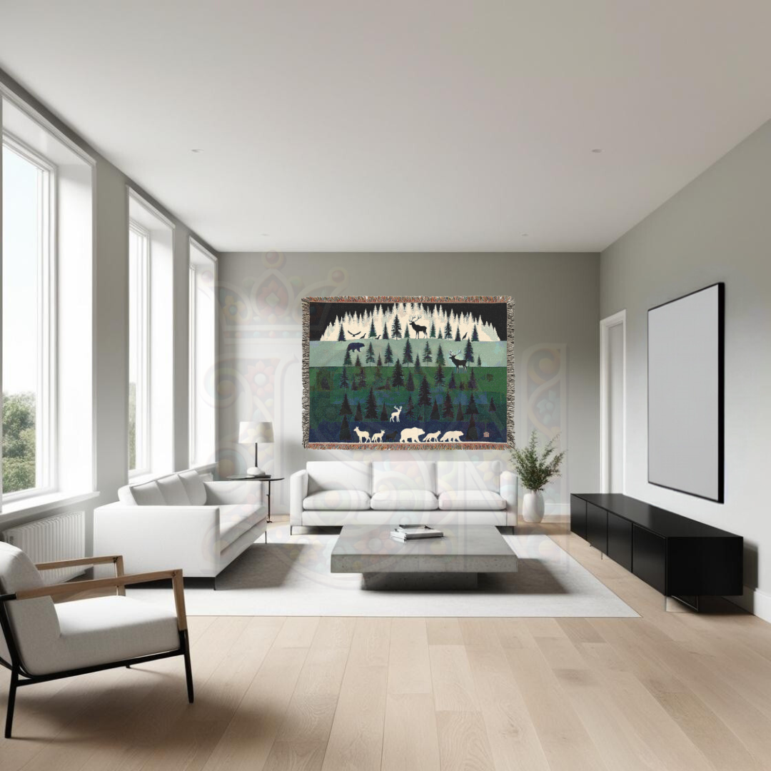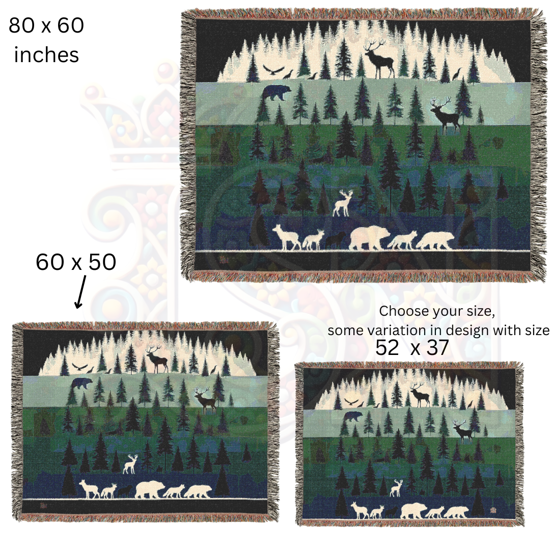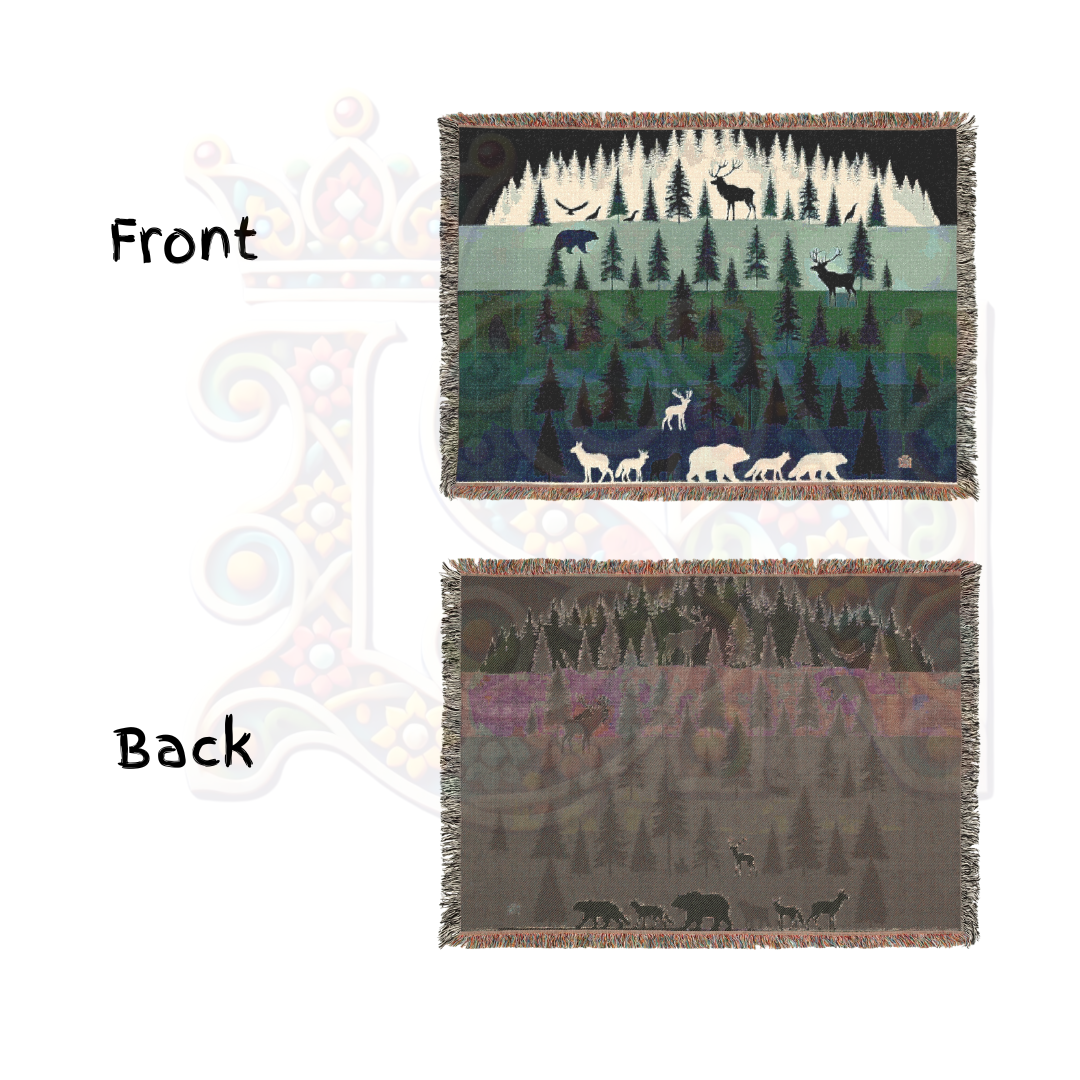 Step into the tranquil beauty of the wilderness with this 100% cotton woven blanket, featuring a layered forest landscape with majestic wildlife. Against a backdrop of towering pine trees, silhouettes of bears, deer, wolves, and birds create a serene yet powerful scene. The rich, earthy greens and deep blues evoke the peace of the great outdoors, making this a perfect addition to rustic, cabin, or nature-themed decor. Crafted with premium cotton for durability and softness, this tapestry throw is as cozy as it is visually stunning.