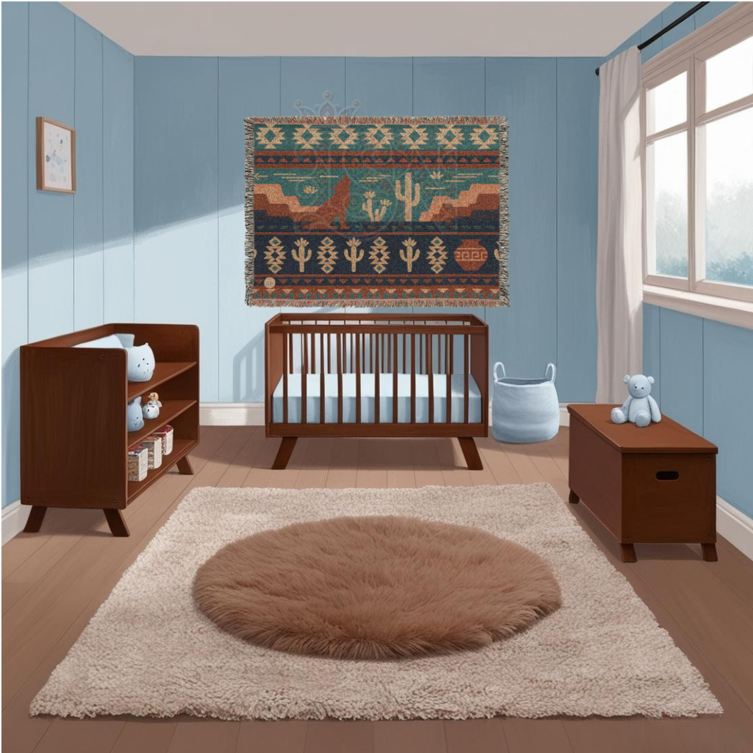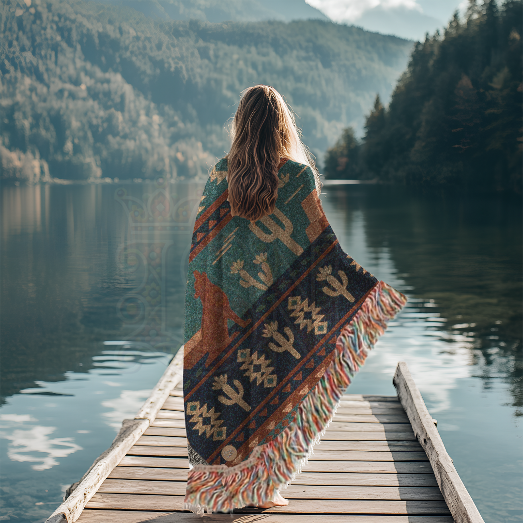 Desert Song – Southwestern Coyote & Cactus Woven Blanket with Folk Pattern