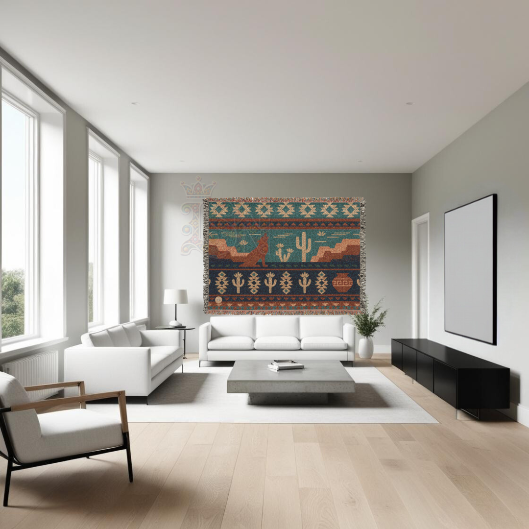 Bring home the bold spirit of the desert with this Desert Song Coyote Woven Throw Blanket, featuring iconic mesa cliffs, flowering cacti, and a lone coyote silhouetted under desert skies. With geometric bands and clay pottery motifs, this piece tells a visual story of rugged land, survival, and enduring beauty 🐾🌄