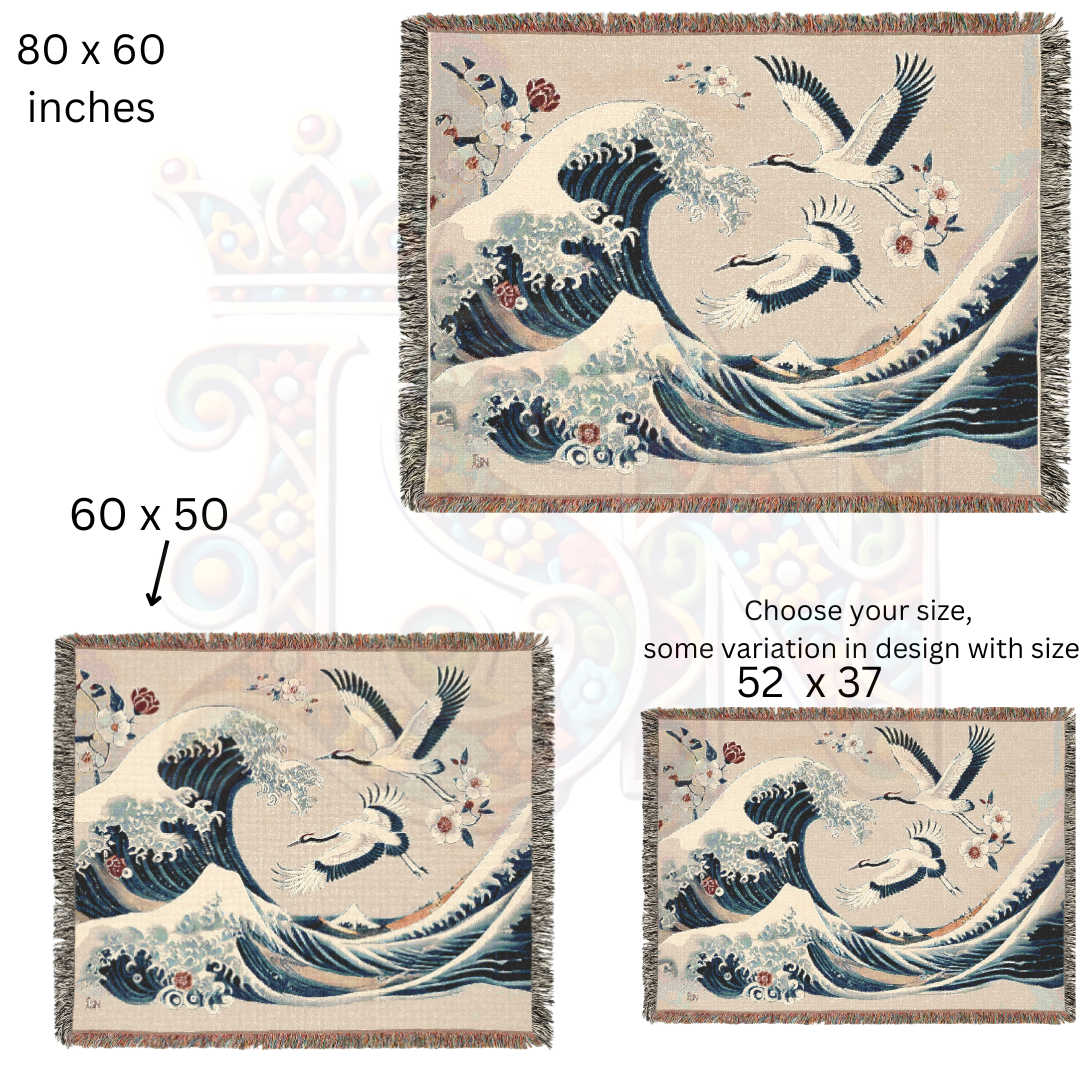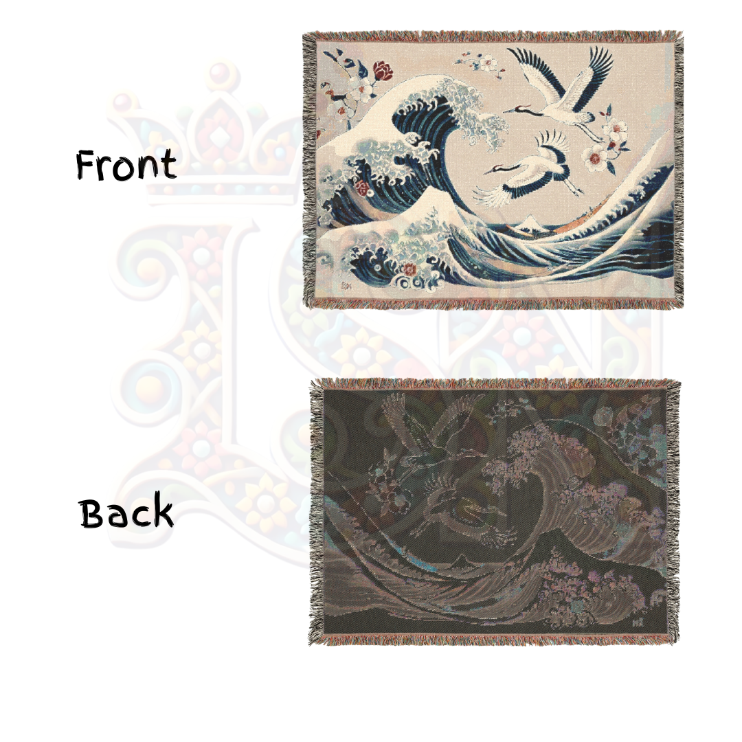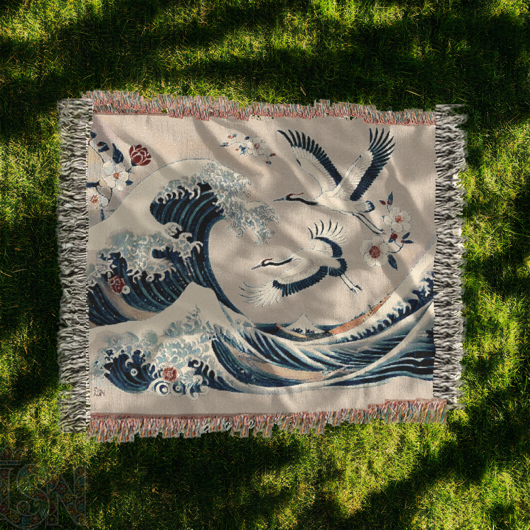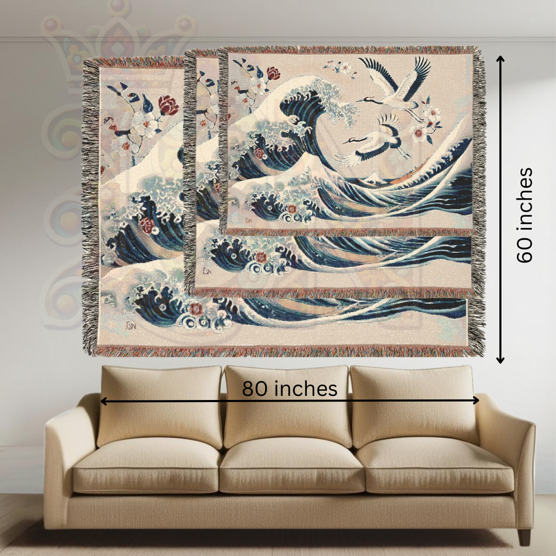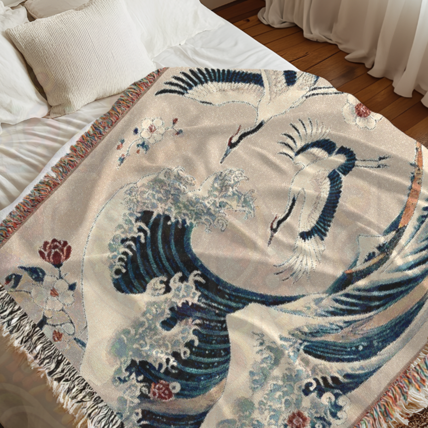 Immerse yourself in the timeless beauty of Japanese art with this 100% cotton woven blanket, featuring a breathtaking blend of powerful ocean waves and graceful cranes. Inspired by traditional ukiyo-e woodblock prints, this elegant tapestry captures the dynamic energy of the sea, symbolizing strength, resilience, and harmony. The intricate woven texture and soft yet durable cotton make this throw a luxurious addition to your space—perfect for adding a touch of refined artistry to your home decor.