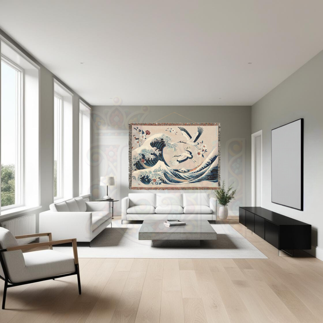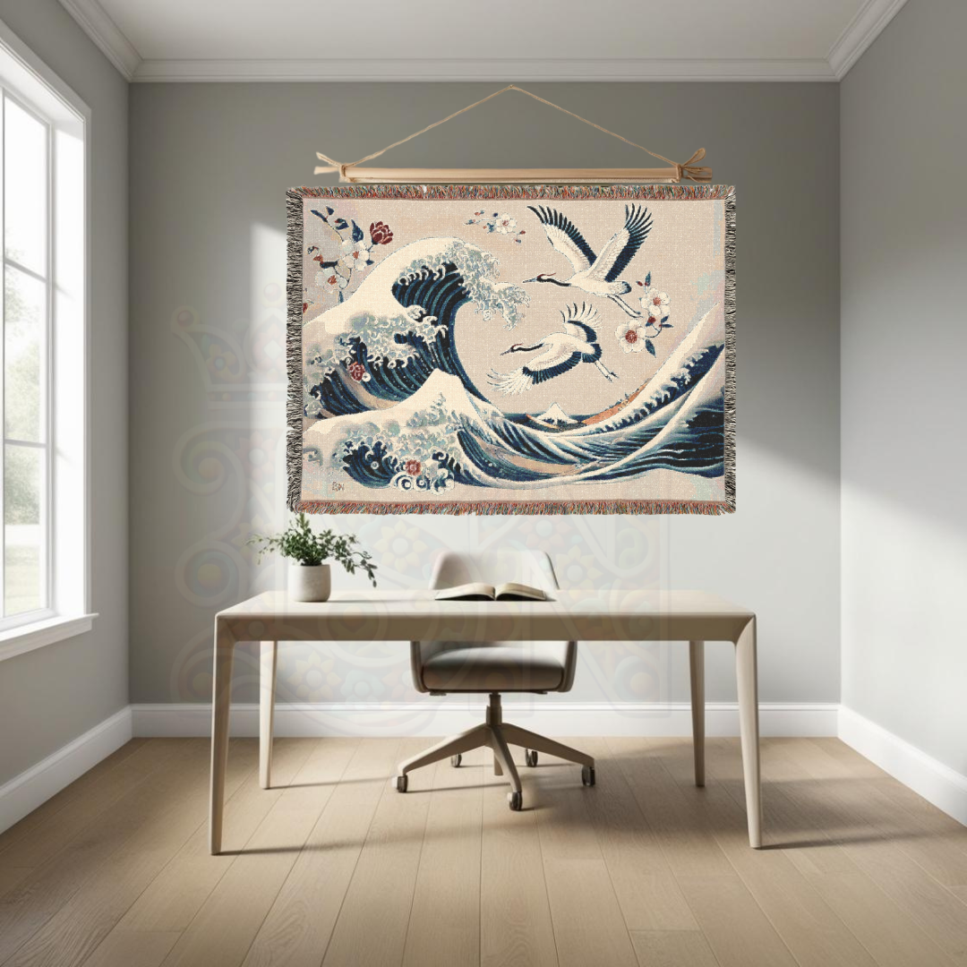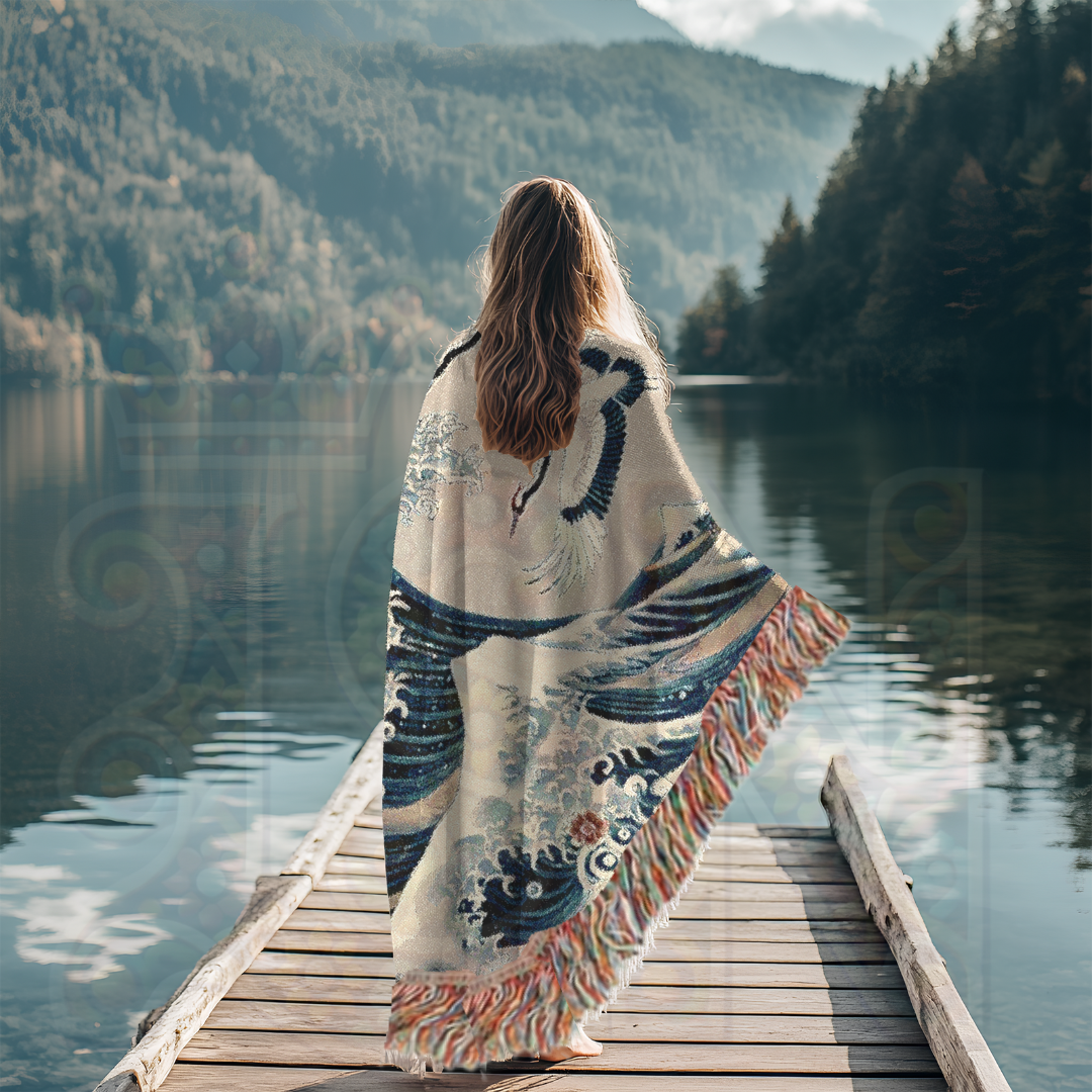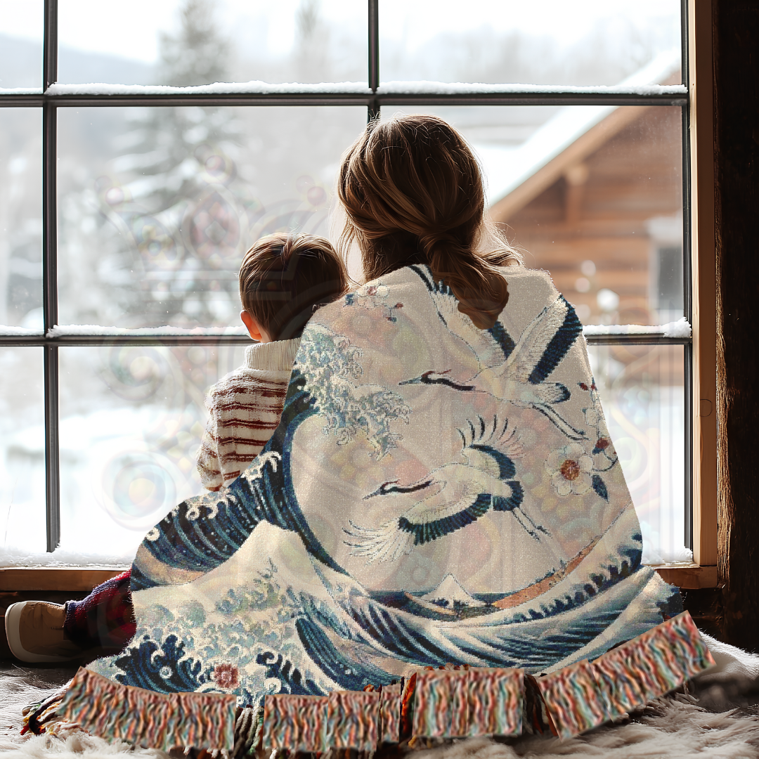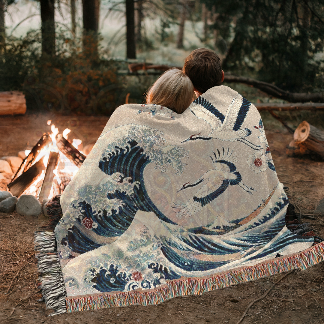 Immerse yourself in the timeless beauty of Japanese art with this 100% cotton woven blanket, featuring a breathtaking blend of powerful ocean waves and graceful cranes. Inspired by traditional ukiyo-e woodblock prints, this elegant tapestry captures the dynamic energy of the sea, symbolizing strength, resilience, and harmony. The intricate woven texture and soft yet durable cotton make this throw a luxurious addition to your space—perfect for adding a touch of refined artistry to your home decor.