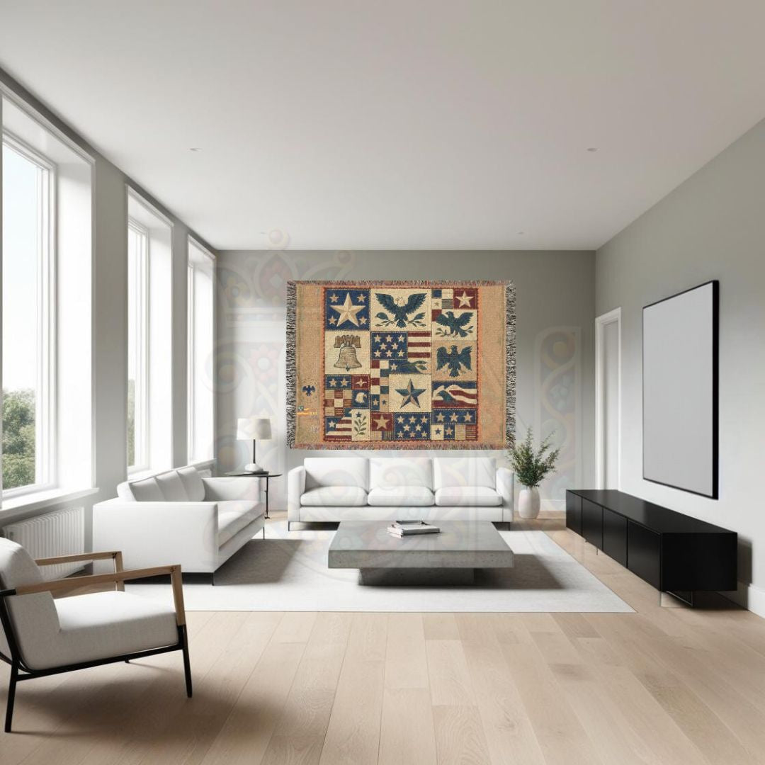 Wrap your space in timeless American pride with this Patriotic Americana Woven Blanket 🇺🇸. Featuring a folk-art patchwork of soaring eagles, stars, flags, and the iconic Liberty Bell, this cozy tapestry brings classic rustic charm to any room. Whether displayed as a striking wall hanging or draped over your favorite chair, it’s a warm, woven tribute to American heritage.