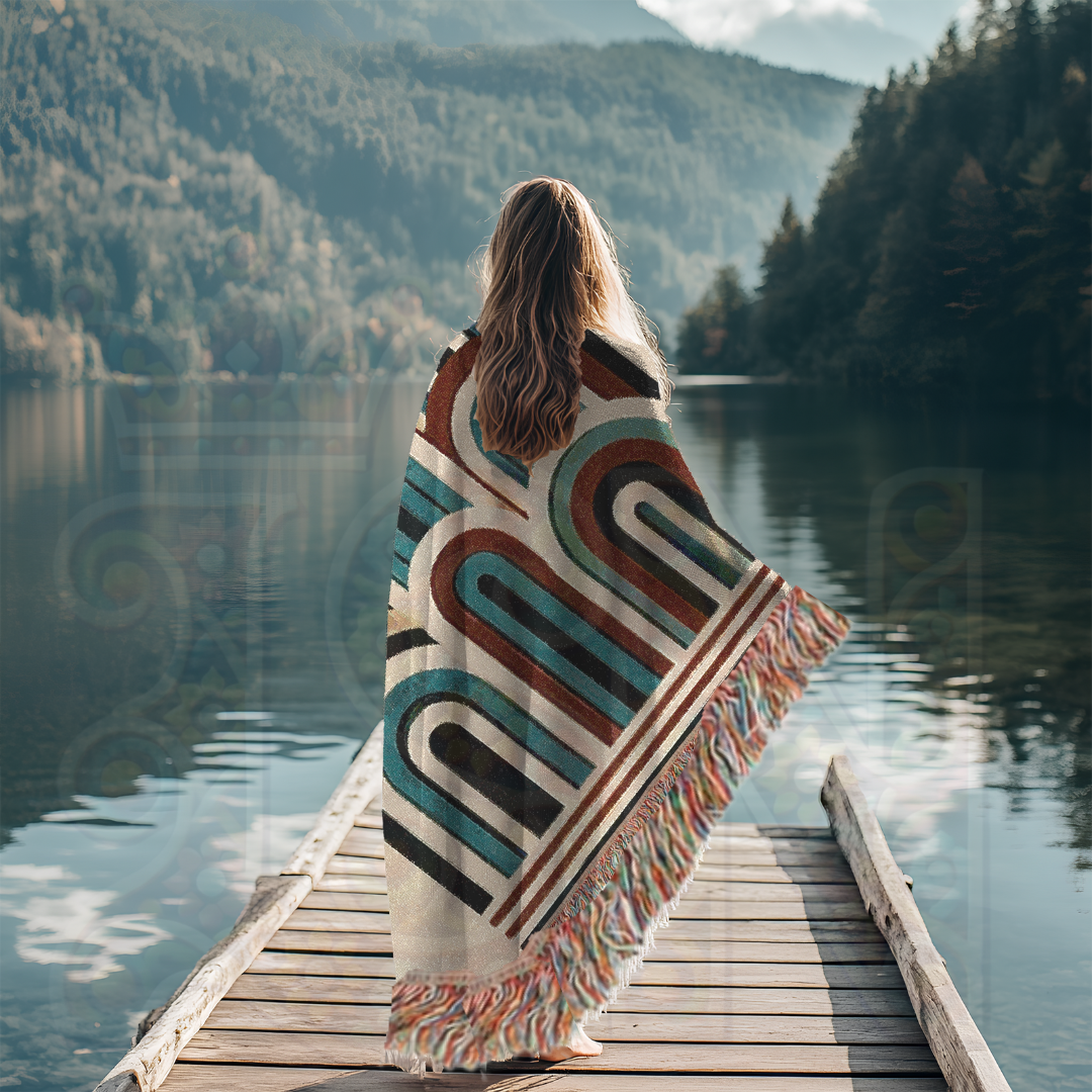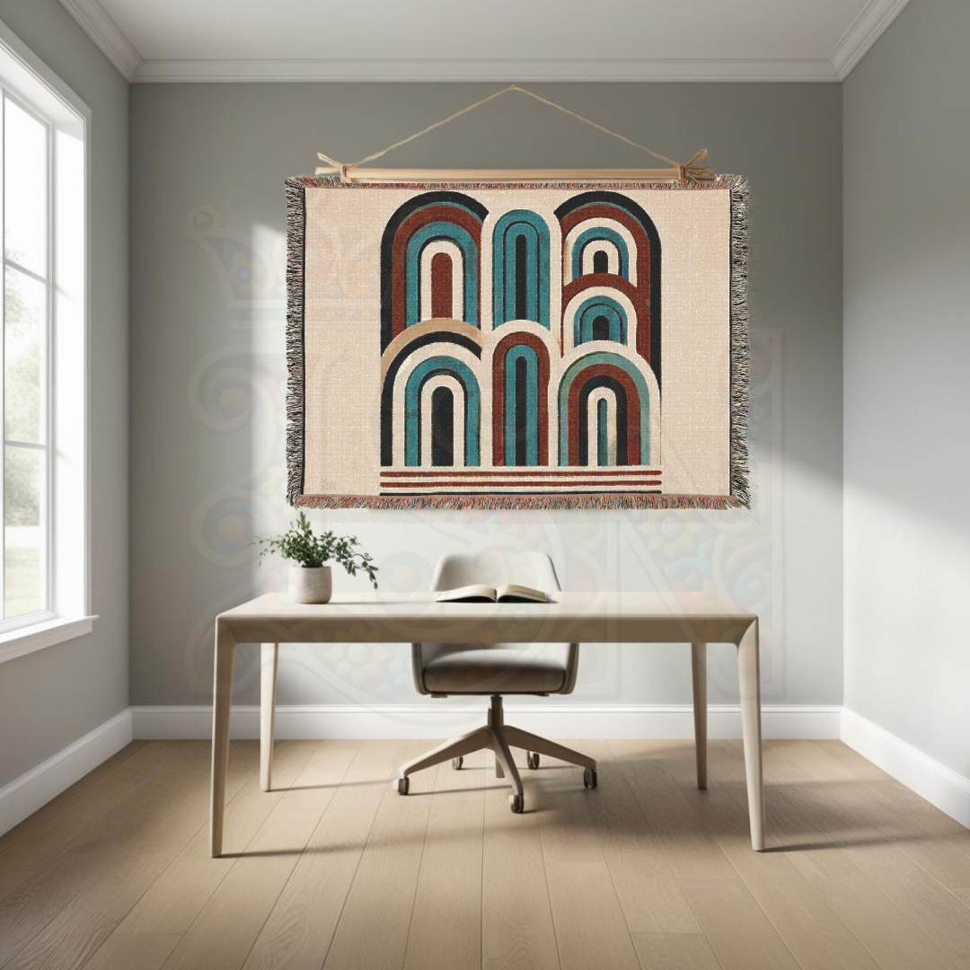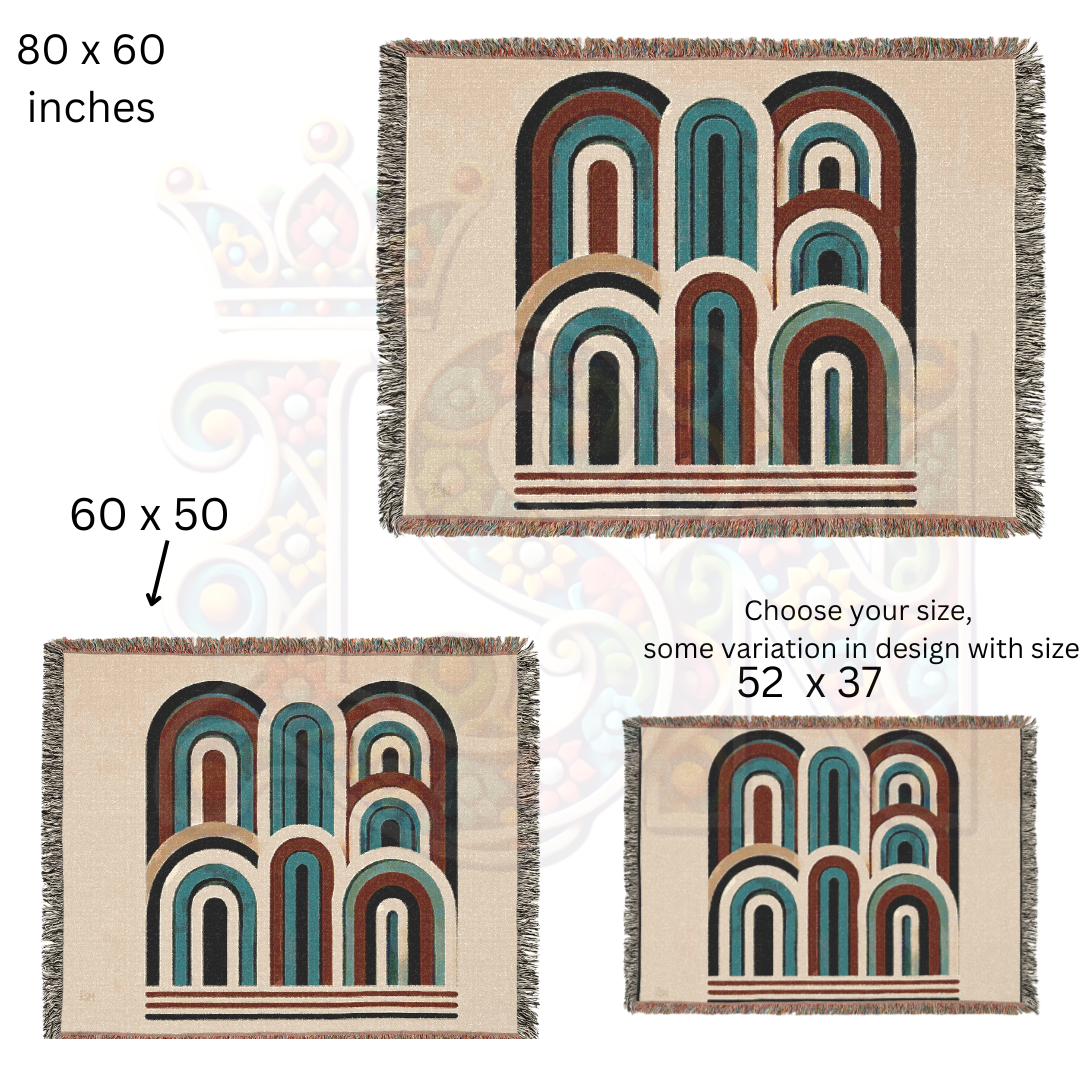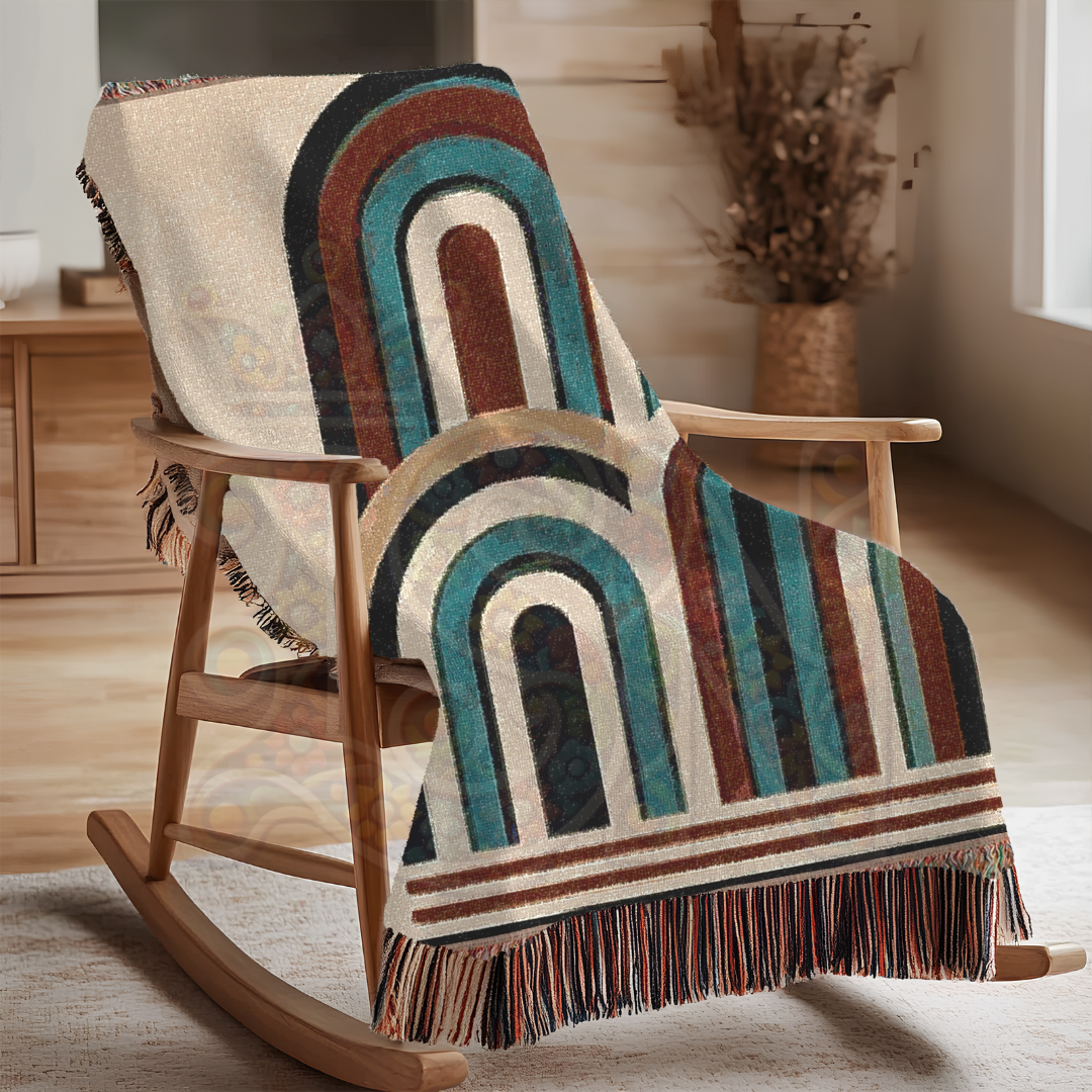 Add a touch of retro charm and modern elegance to your space with this 100% cotton woven blanket. Featuring a bold geometric arch design, this tapestry blends bohemian, mid-century, and contemporary aesthetics with earthy tones of rust, teal, and beige. The structured yet organic pattern makes it a statement piece—perfect for cozying up on the couch, styling as a wall hanging, or draping over your bed for a warm and artistic touch.
