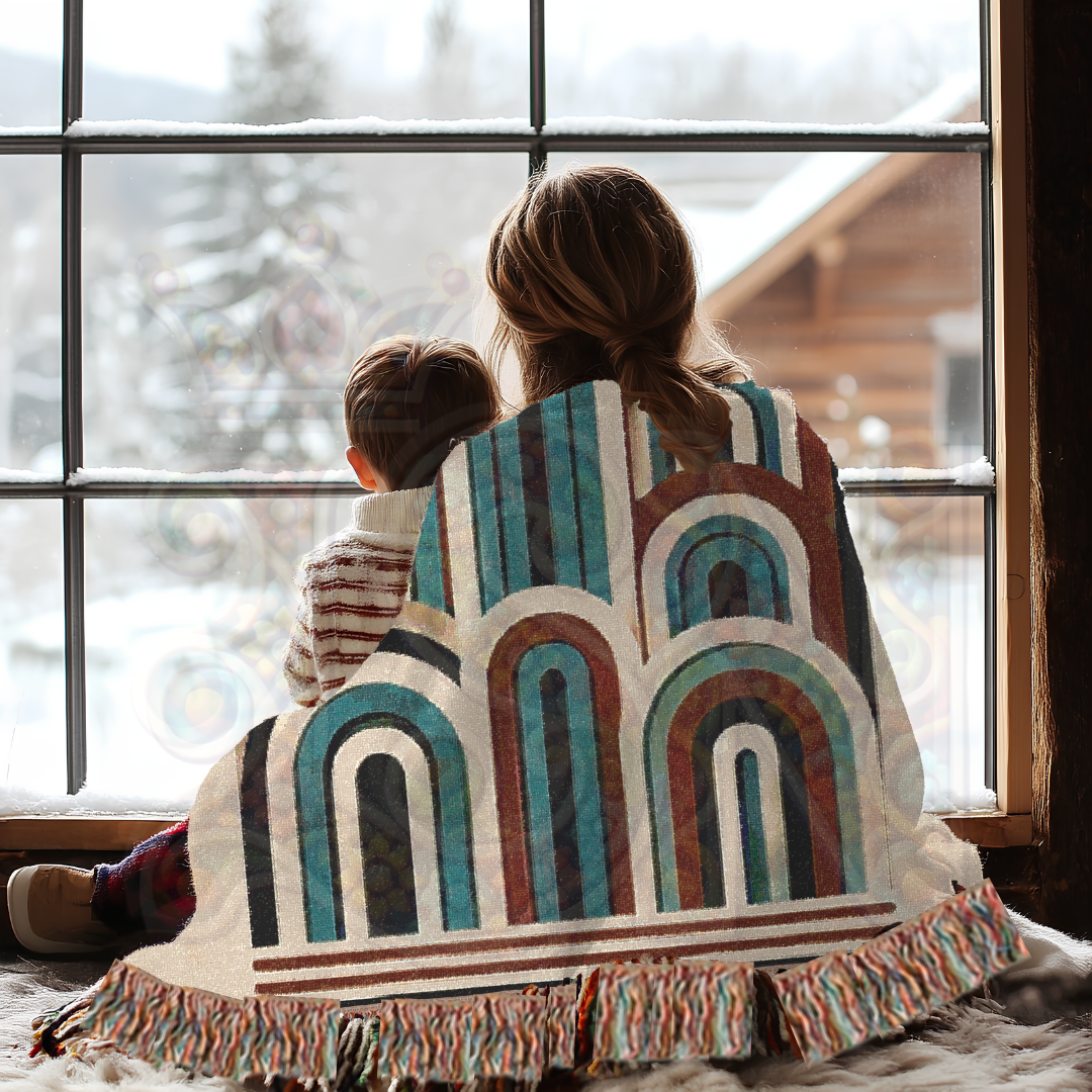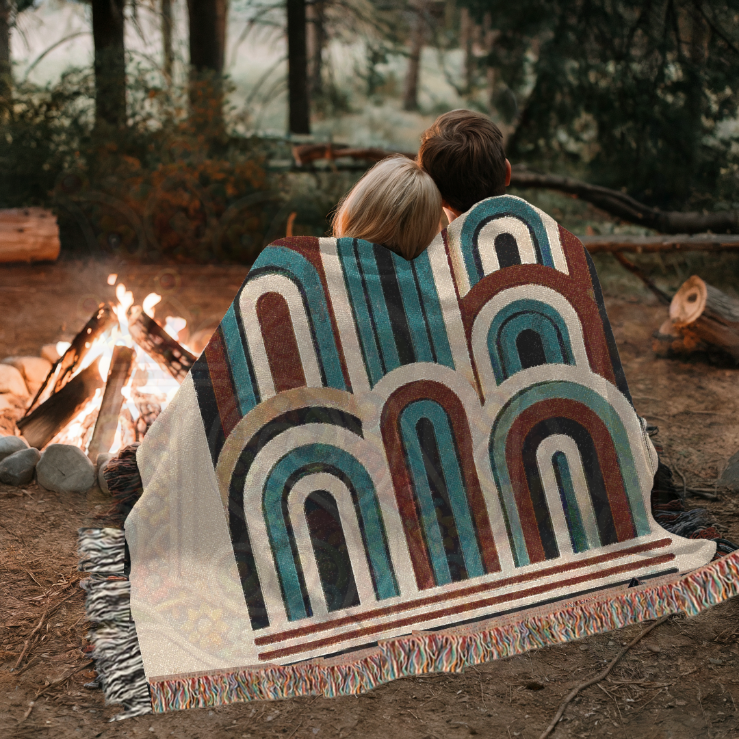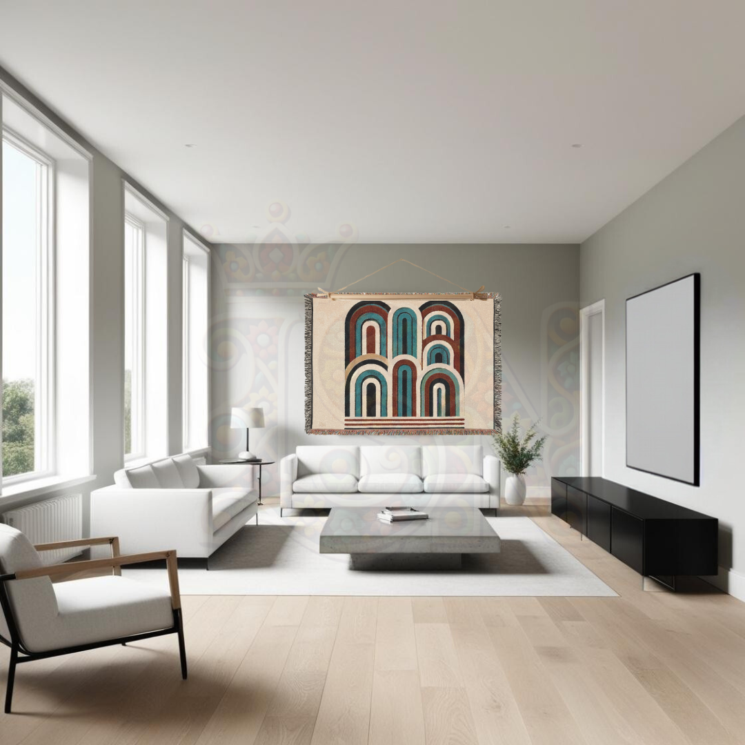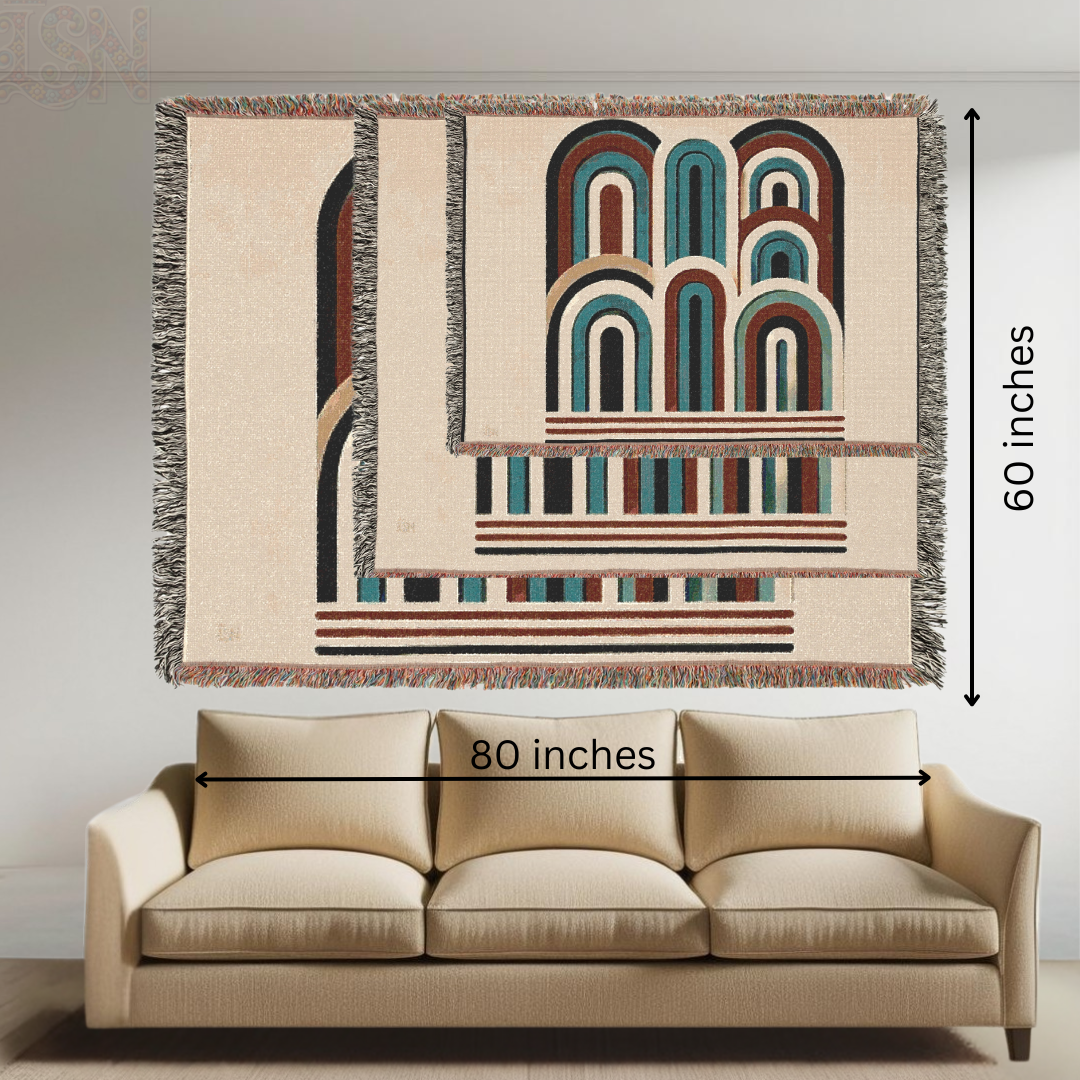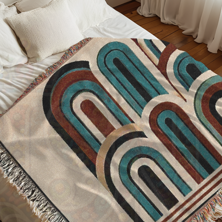 Add a touch of retro charm and modern elegance to your space with this 100% cotton woven blanket. Featuring a bold geometric arch design, this tapestry blends bohemian, mid-century, and contemporary aesthetics with earthy tones of rust, teal, and beige. The structured yet organic pattern makes it a statement piece—perfect for cozying up on the couch, styling as a wall hanging, or draping over your bed for a warm and artistic touch.
