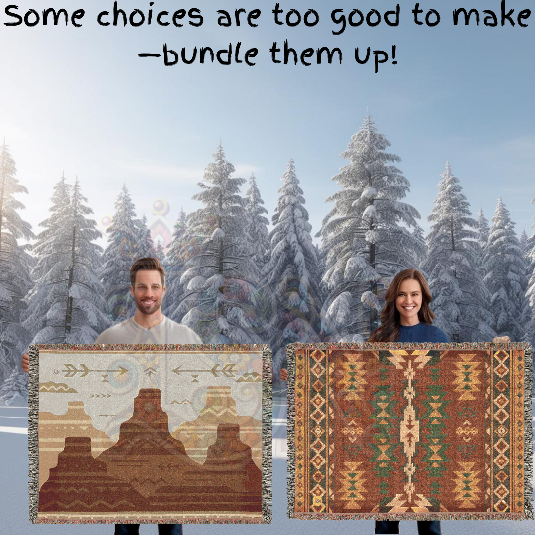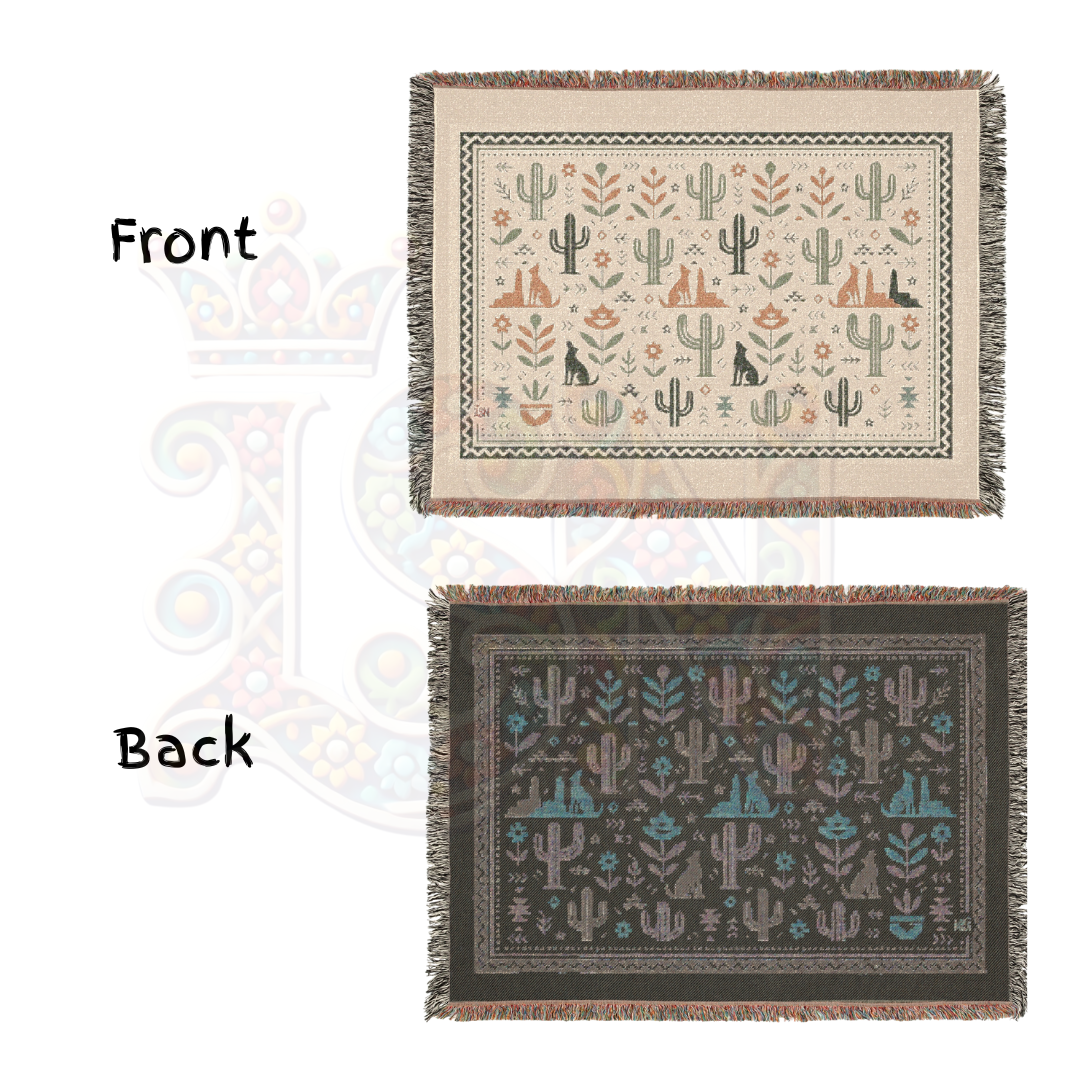 Tell a story in threads with this Southwest Desert Folk Woven Throw Blanket, featuring hand-drawn-style motifs of howling coyotes, blooming desert florals, cactus clusters, and mesa formations. The visual rhythm of this design captures the heartbeat of desert life—wild, serene, and deeply connected 🌵🐺