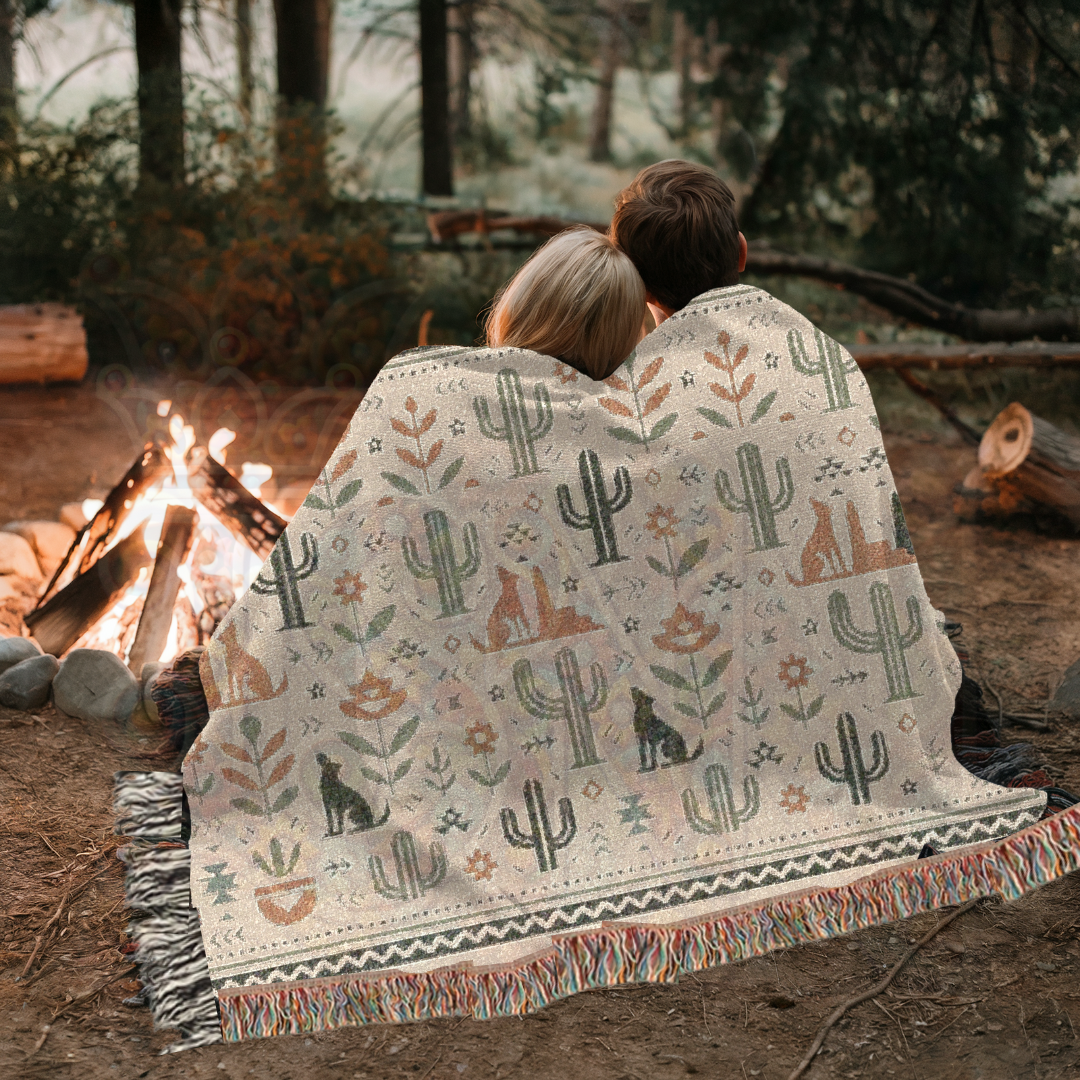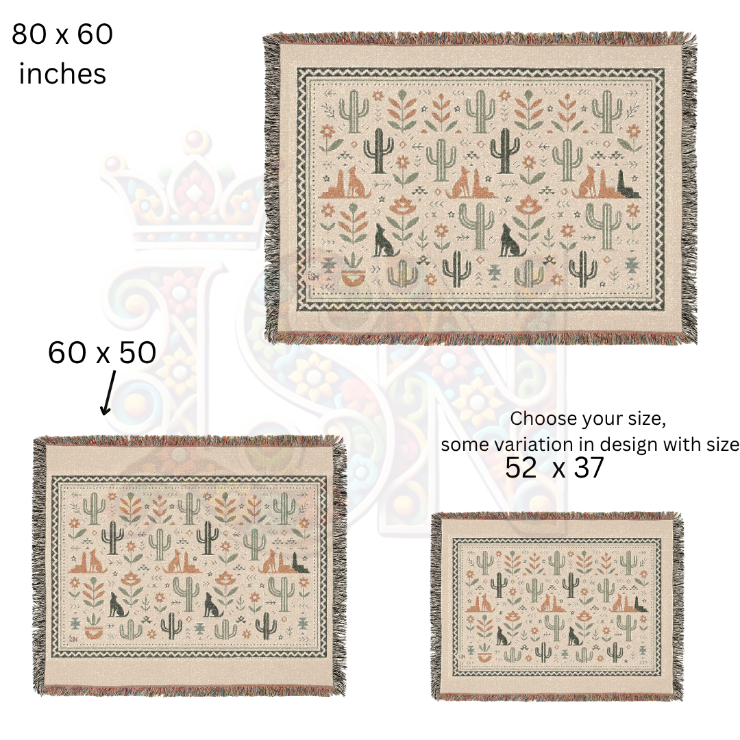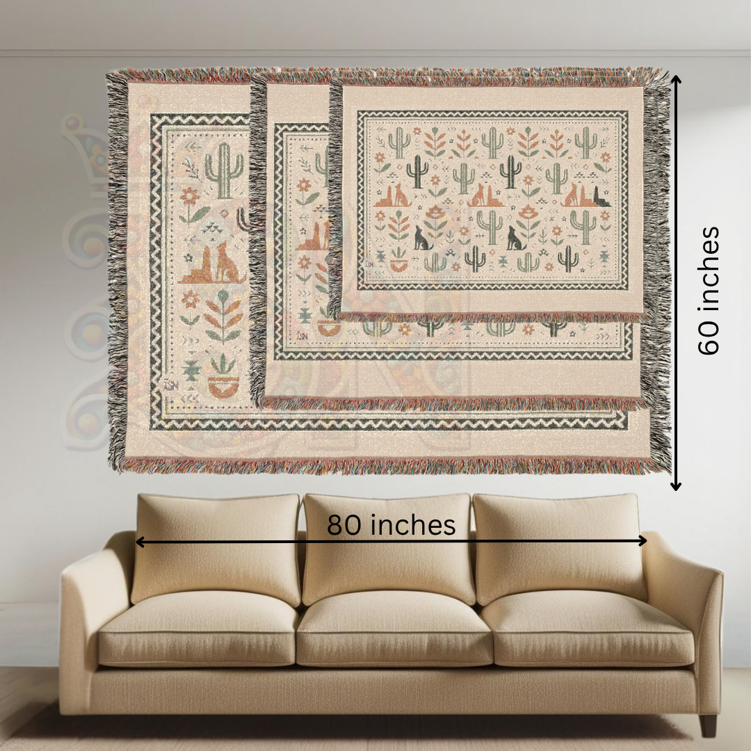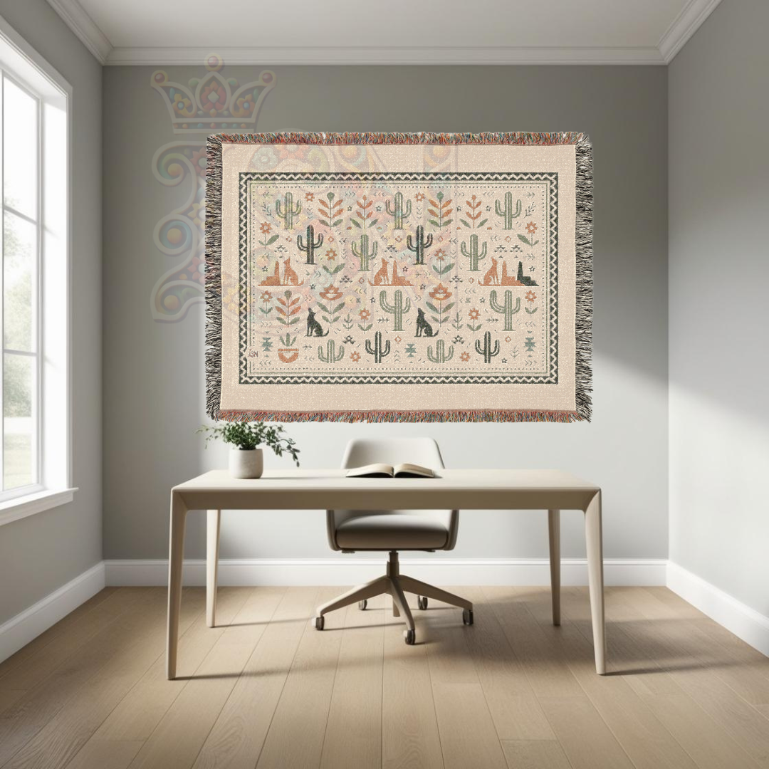 Call of the Desert – Southwestern Woven Blanket with Coyote, Cactus & Folk Motifs