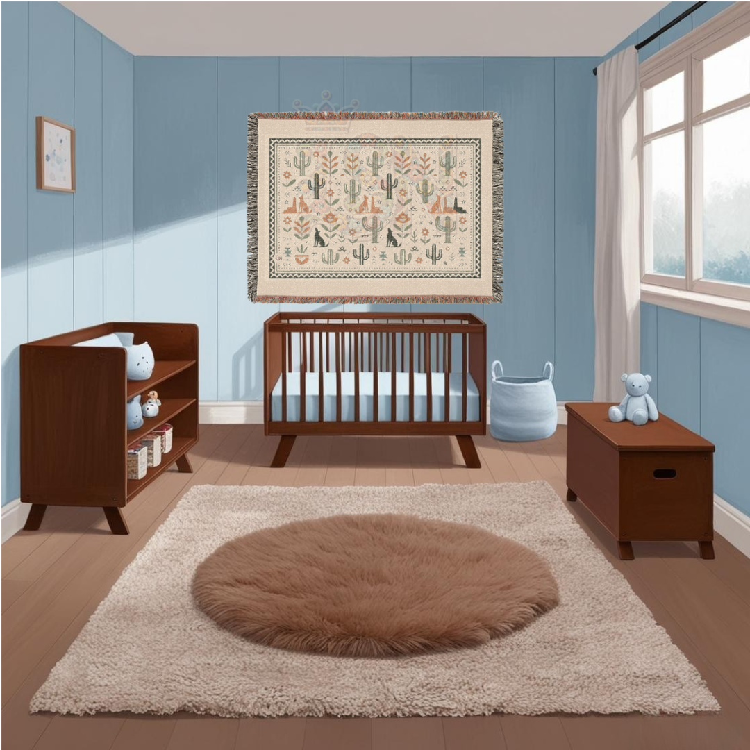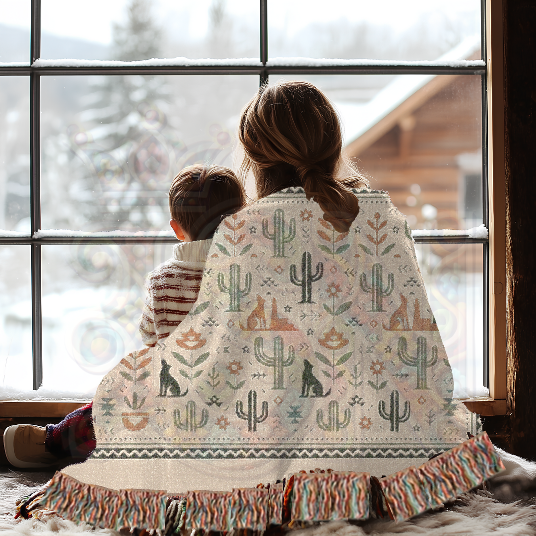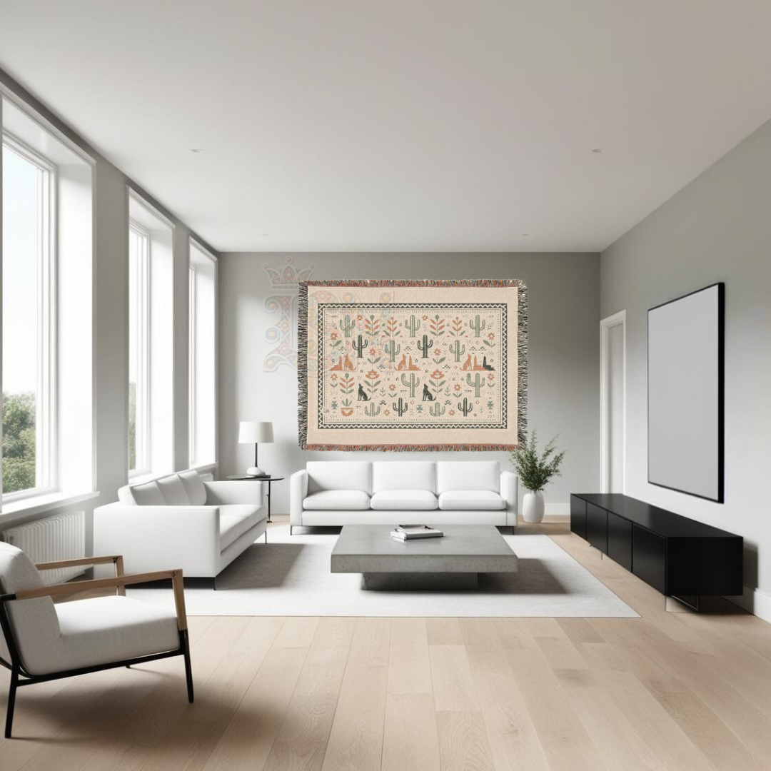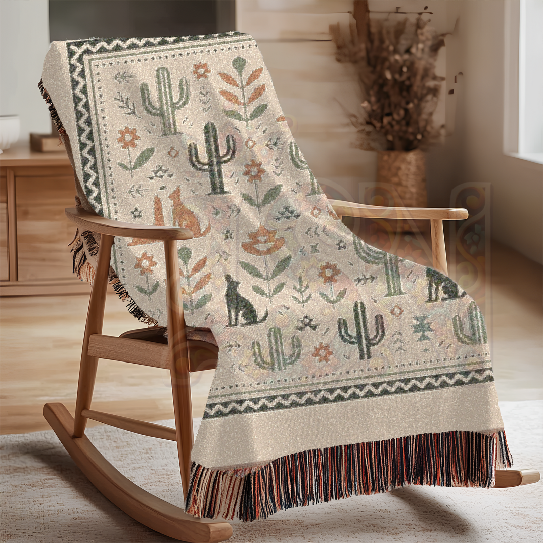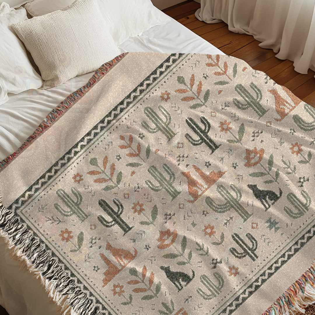 Call of the Desert – Southwestern Woven Blanket with Coyote, Cactus & Folk Motifs
