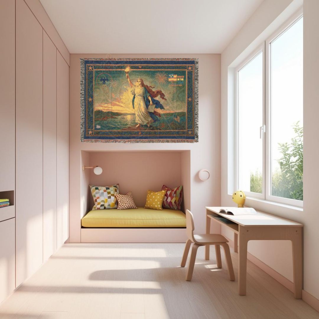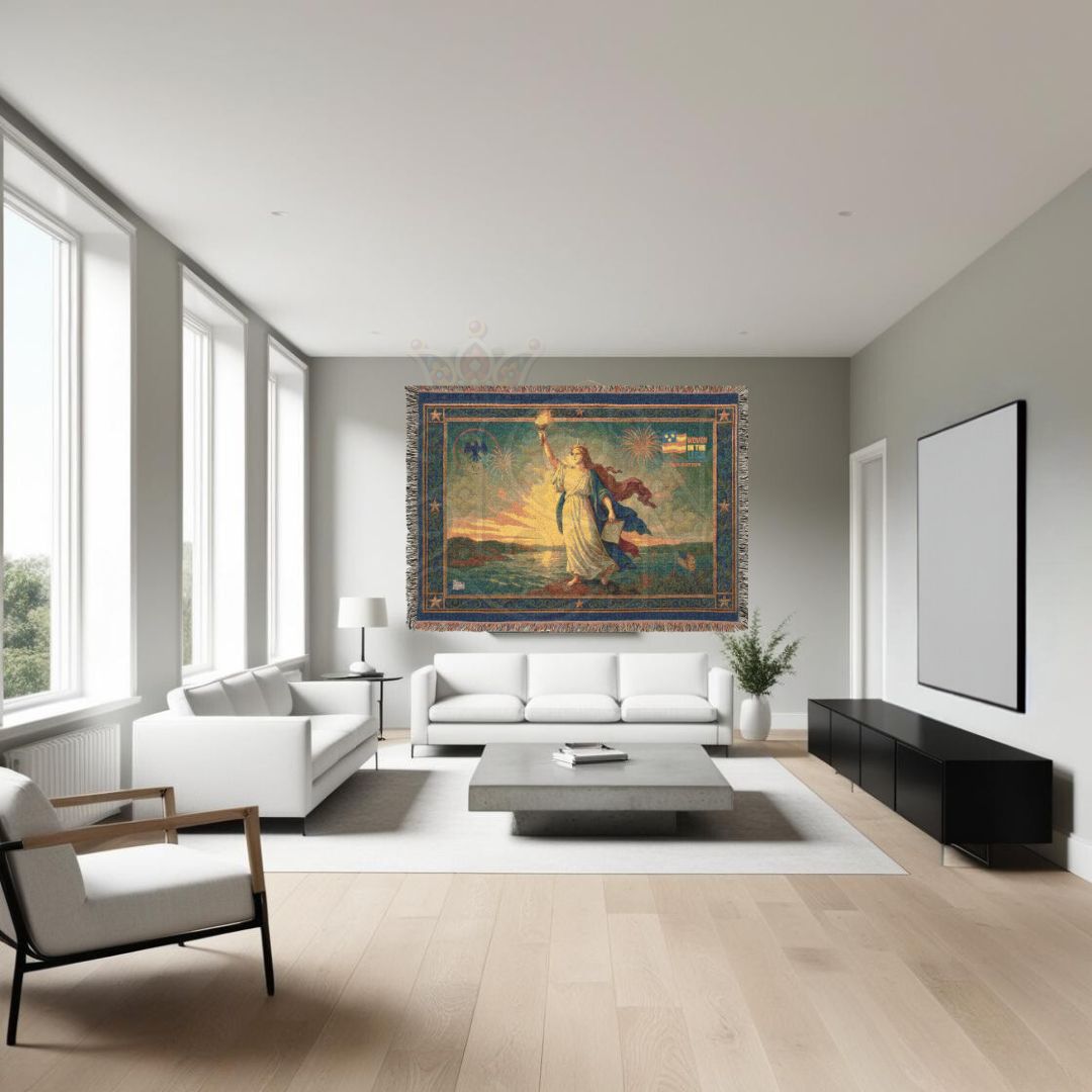 In this radiant woven tribute, Liberty herself strides forth from the shore, torch blazing against a dusky sky painted in warm oranges and midnight blues. Fireworks bloom behind her like celestial flowers. Her robe catches the wind, echoing the motion of the sea below and the spirit of freedom she carries.