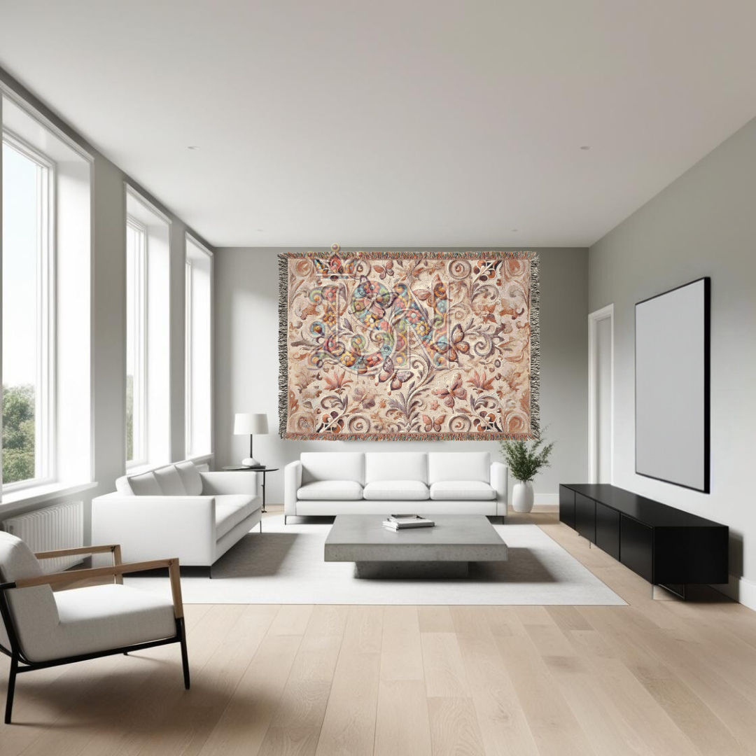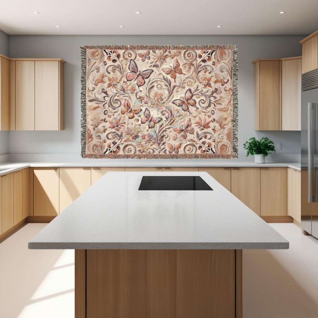 Delicate butterflies drift through a garden of curling vines and soft floral scrolls in this romantic woven blanket design. Rendered in gentle blush, rose, and neutral tones, this tapestry brings a touch of airy elegance to any space.