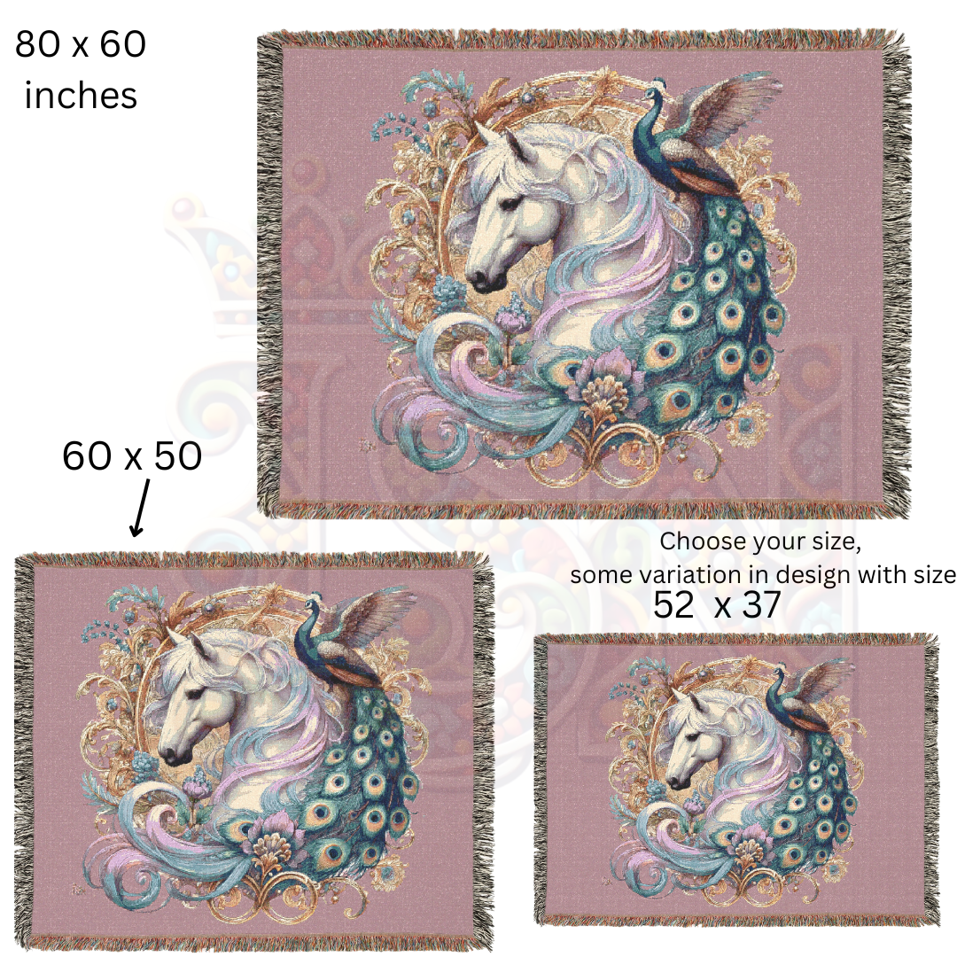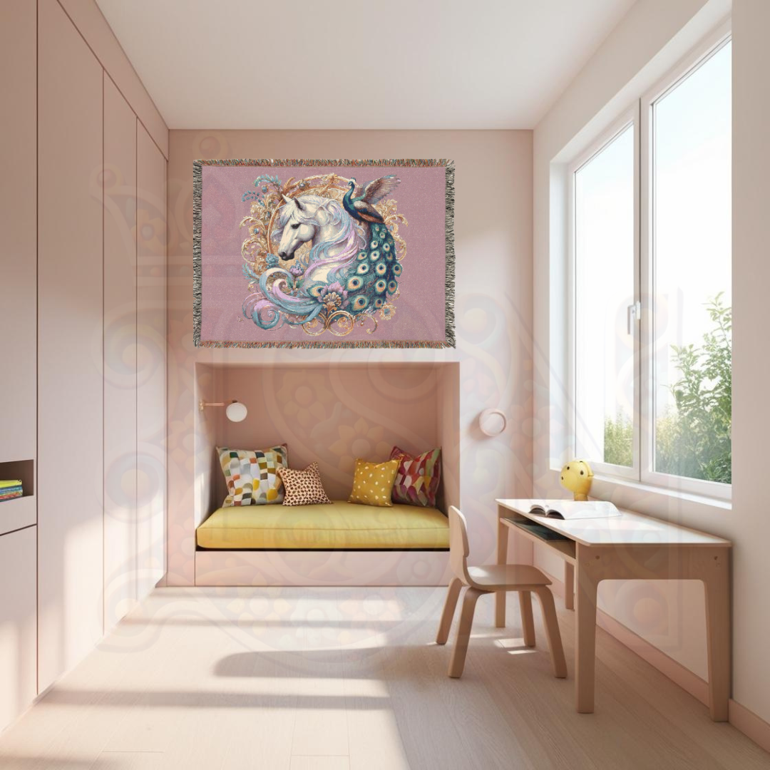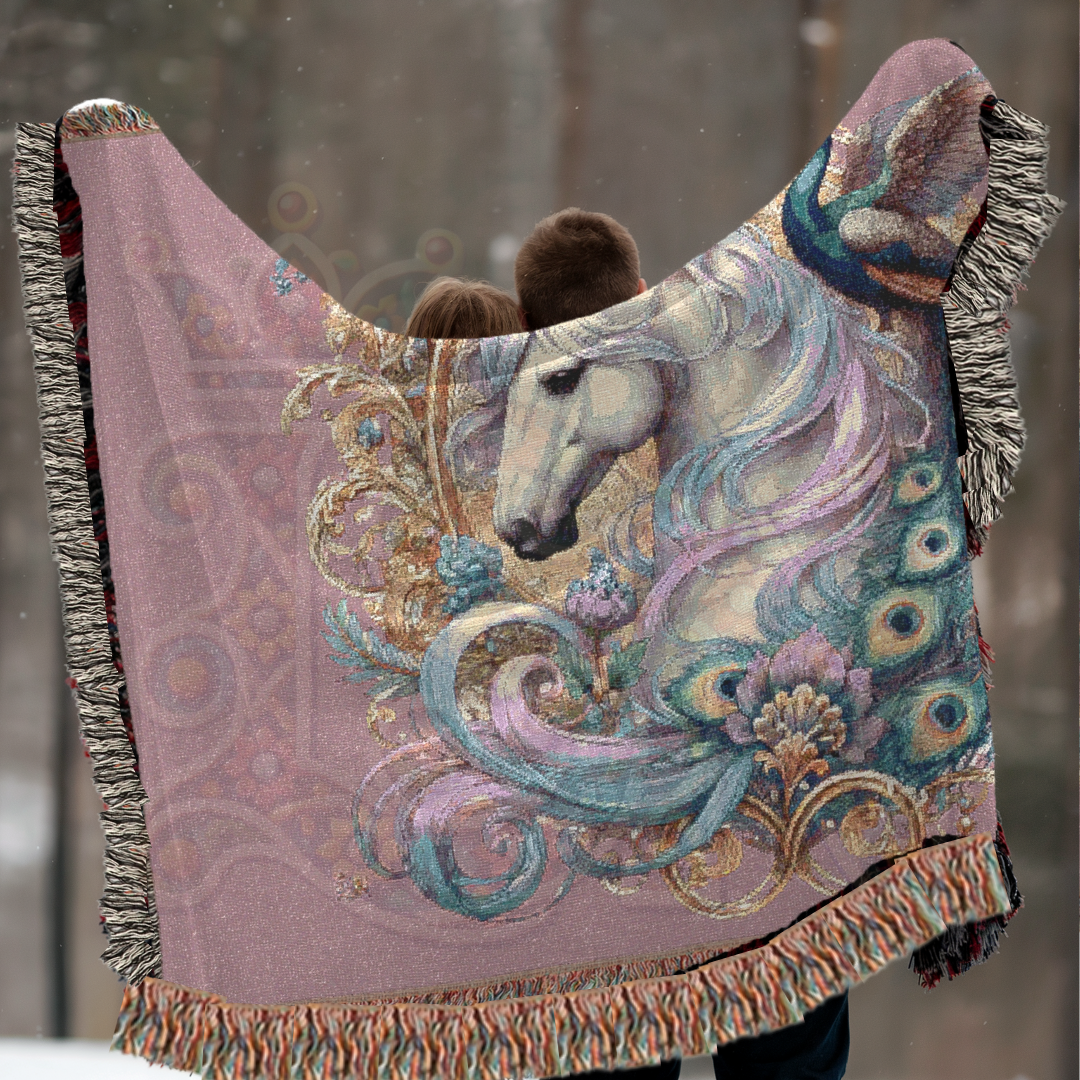 Embrace the serene beauty of this exquisite woven blanket, featuring a graceful white horse and a majestic peacock against a tranquil pink backdrop. Crafted from 100% cotton, this high-quality tapestry throw combines elegance and comfort, making it a perfect addition to your living room, bedroom, or creative space. The intricate detailing of the peacock’s vibrant feathers and the horse’s flowing mane evokes a sense of mystical harmony and refined artistry.