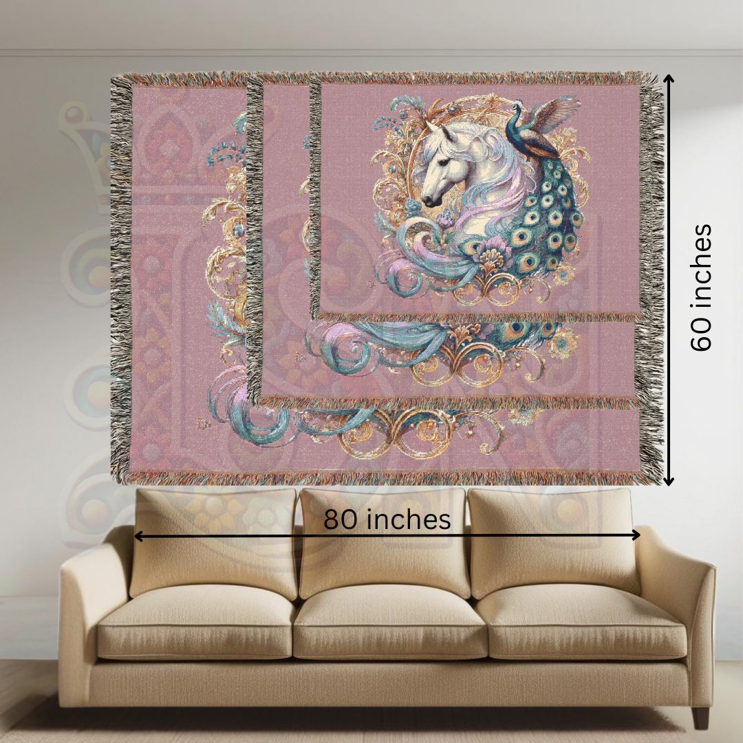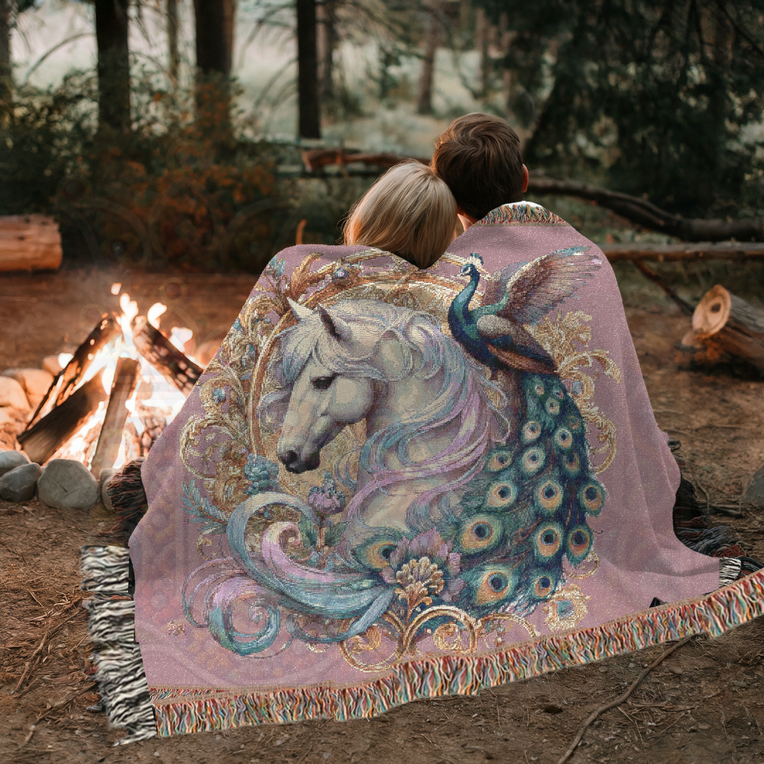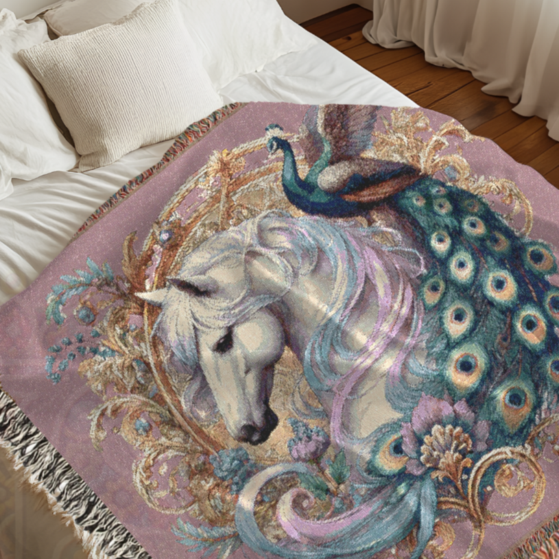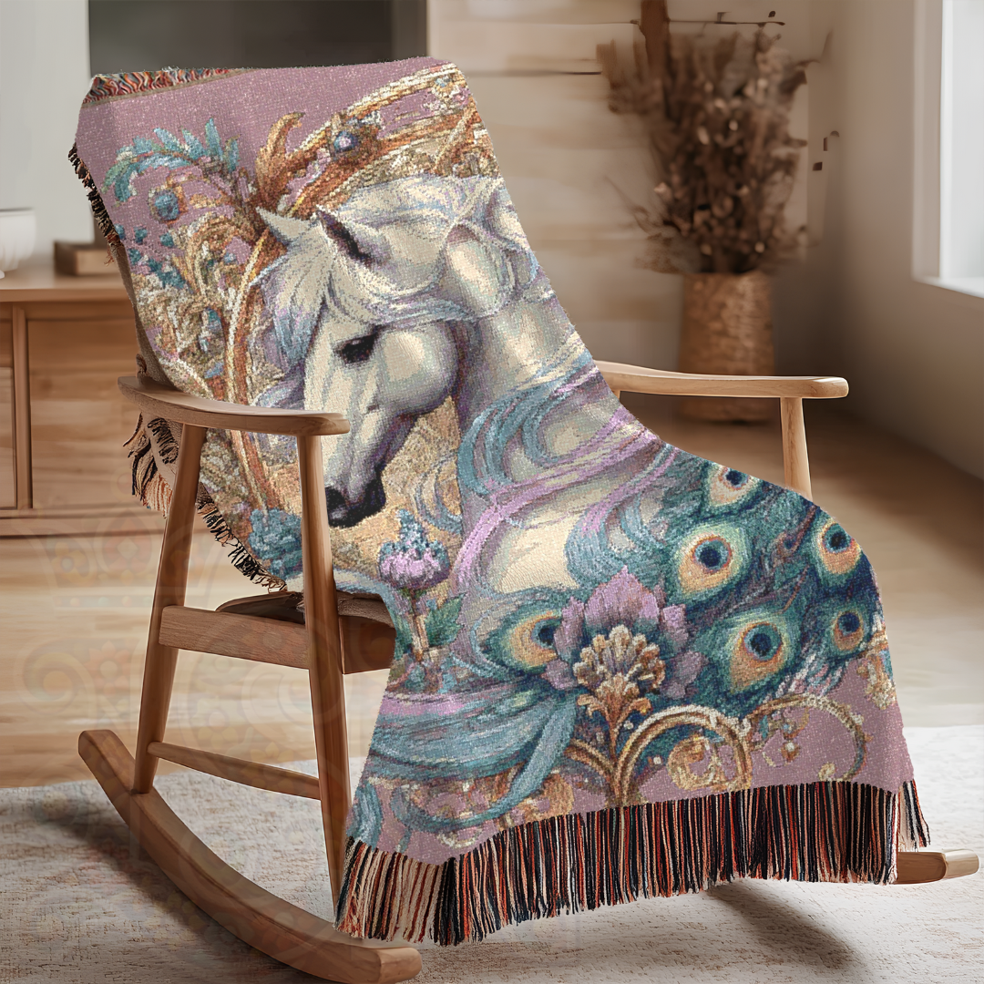 This woven masterpiece is a thoughtful gift for horse lovers, peacock enthusiasts, and those who appreciate sophisticated home decor. Designed with soft, breathable fabric and finished with fringed edges, it is ideal for snuggling, displaying as a wall hanging, or layering over furniture. Whether used as a cozy wrap or an artful statement piece, this luxurious throw adds charm and elegance to any space.