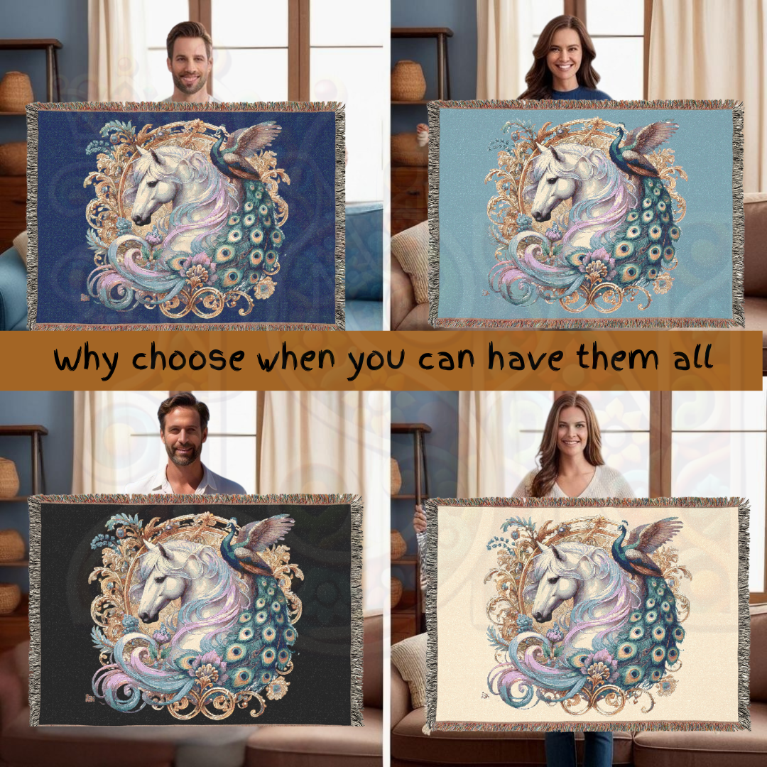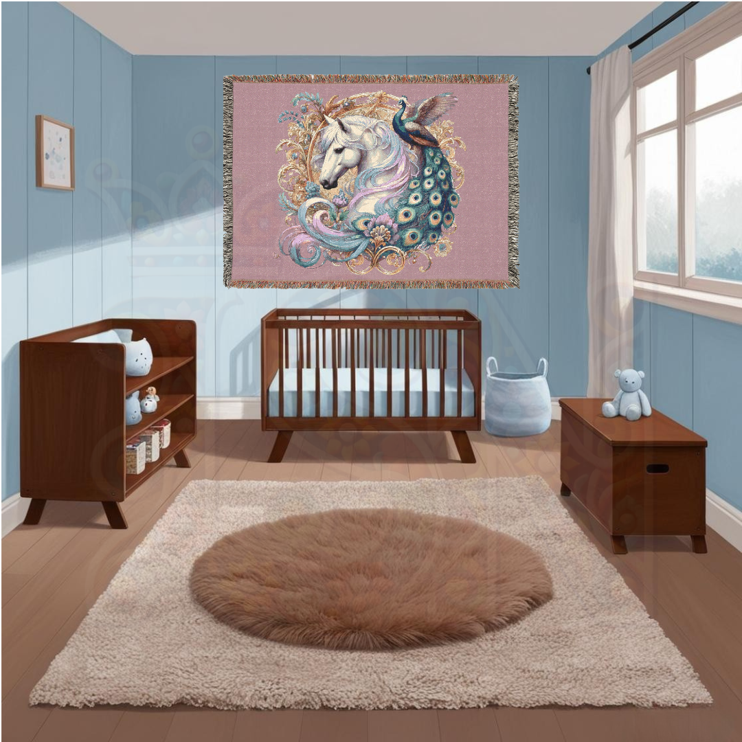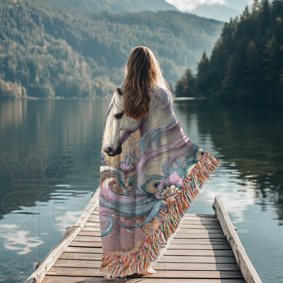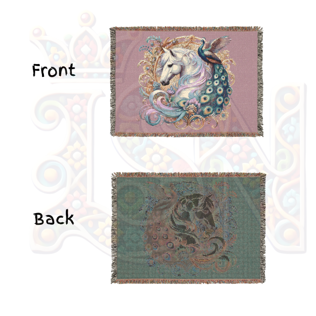 This woven masterpiece is a thoughtful gift for horse lovers, peacock enthusiasts, and those who appreciate sophisticated home decor. Designed with soft, breathable fabric and finished with fringed edges, it is ideal for snuggling, displaying as a wall hanging, or layering over furniture. Whether used as a cozy wrap or an artful statement piece, this luxurious throw adds charm and elegance to any space.